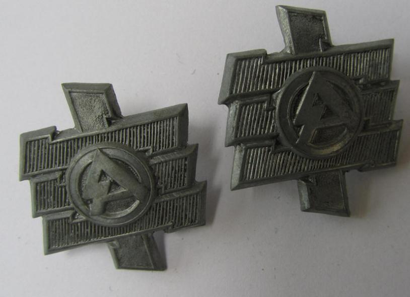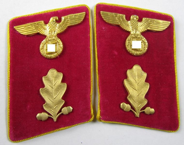 This is a truly stunning - and fully matching! - set ie. pair of rarely encountered N.S.D.A.P.-type, velvet-based collar-patches of the fourth (and final) pattern, as intended for a: N.S.D.A.P. Abschnittsleiter at Reichsleitungs-level, in overall very, nice (IMO mint-/unissued!) condition. The neat pieces - which are constructed from the light-red (ie. almost pinkish-red) coloured, smooth-type ie. velvet-like cloth - are in a wonderfull condition overall: they both have the neat metal (ie. zinc- based) golden-toned (eagle-) devices and/or oakleave-devices attached and were (IMO) never mounted on a tunic. The tabs are piped with golden-yellow-coloured, rayon-based piping and are constructed from light-red coloured velvet, signifying that the pair was intended for a party-official at: Reichsleitungs-level. One of the tabs still shows its (partly damaged), paper-based RzM-etiket. The set was most certainly never worn but originates from the US where it was brought as a veteran-bring-back-item: it shows some (truly non-disturbing) tarnish and/or aging caused by having been stored for decades. In any case is this a neat and high-ranked N.S.D.A.P.-collar-tab set that is scarcely encountered and that is not often offered for sale. Only the first such neat N.S.D.A.P.-related item in this particular rank I ever had on offer!