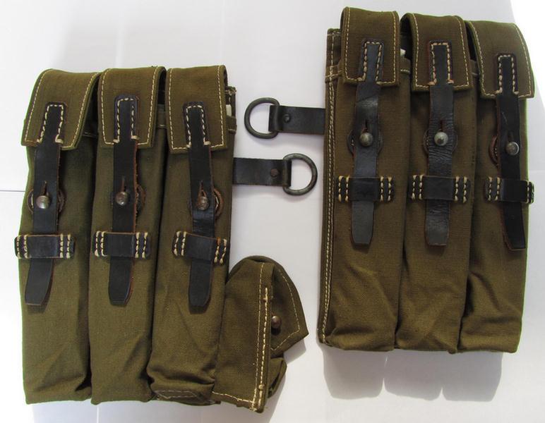 This is a truly awesome - and nowadays rarely encountered! - pair of fully matching WH (Heer ie. Waffen-SS) reed-green coloured, so-called: MP38-40 pouches, which are clearly maker-marked: 'CLG 43' and bearing a 'Waffenamt Abnahme'-stamp, both in absolute stonemint ie. unissued condition. Both (identically produced) pouches are in a very nice condition and are clearly not have been used at all: they were always together and make a fully matching pair. Both pouches are nicely marked on the back with the makers-mark (ie. 3-digit code) that reads: 'CLG' (signifying that they are a 'text-book' pair as produced by the company: 'Ernst Melzig Lederwaren' based in Liegnitz), a clear 'Waffenabnahme' stamp and a date of production: '43' (ie. signifying the year 1943). The fine-grain leather of both pouches is excellent and of course fully functional: none of the (sometimes fragile) straps is broken nor damaged. All metal parts (rings and snaps are a bit dusty as usual but nothing shocking). The set originates from my own collection and was on a mannequin for years. These original MP pouches sets are getting harder to find and this set would look superb if remounted on a mannequin. A nowadays hardly ever offer for sale set of original and matching pouches that is not inexpensive but fully worth its money!