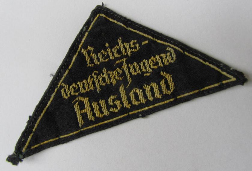 This is a very nice and extremely rarely encountered - and truly worn! - example of a male-type 'Hitlerjugend' (or HJ) district-triangle, entitled: 'Reichs-deutsche Jugend Ausland', in overall nice albeit clearly used and/or worn and somewhat 'faded' condition. As stated is the neat triangle in an overall nice condition overall and shows fair wear and/or age. This is a 'male' specimen, woven in (golden-) yellow coloured linnen on a black-coloured (also linnen) background. The piece misses its 'RzM' etiket as more often (something most certainly caused due to regular usage ie. wear). Simply a very nice and actually worn and shirt-removed example that I have priced according to its 'faded' ie. worn condition. It should be noted that this is simply a very rare piece that show only very limited usage: only the second such district-triangle I ever had on offer!