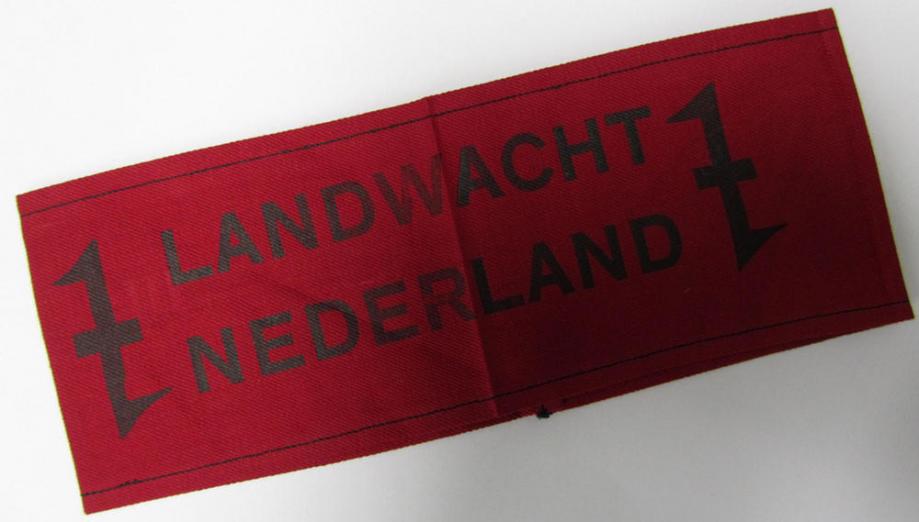 This is a text-book example of the rare Dutch volunteer printed 'Landwacht Nederland' armband, executed in burgundy-red coloured linnen, bearing a unique printed number on the inside that reads: III - 2352 - very nice, IMO mint-/unissued, condition. These (notorious!) 'Landwacht' units (which were strictly NSB ie. Dutch Nazi party controlled) were founded in 1943/1944 were mainly used for police- control checks and had a very nasty reputation. The band - which has a folded length of 42 cms. shows no staining nor wear and still has a hardened touch as when it left the factory: it was most certainly never worn. It shows the (black coloured and printed) text 'Landwacht Nederland' flanked by two 'wolfshook' symbols. Simply a very rare Dutch collaborationist item!