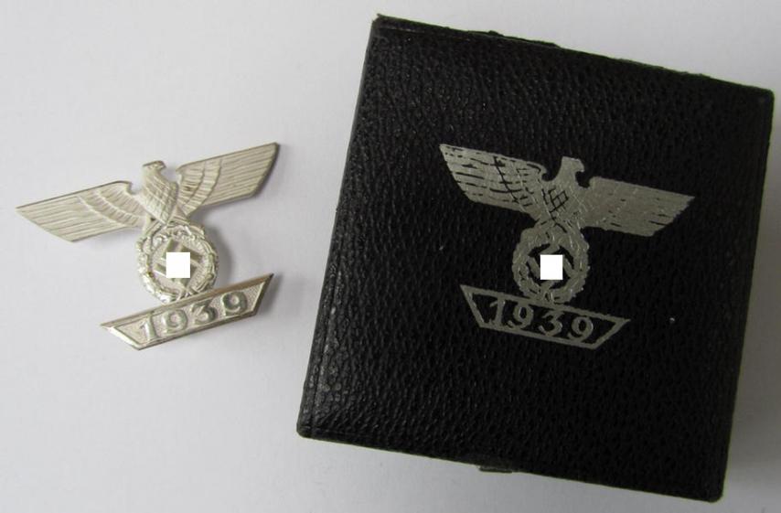 This is a truly superb 'Widerholungs Spange EKI' (bar to the WWI IC 1st. class), that comes in its (rare!) simulated leather box as issued, in very nice and almost mint/unissued condition. The piece still retains most of its 'high polished sides ('Hochpolierte Kanten') and is very detailed and pronounced. Naturally is the original pin/catch set-up present and fully functional: the piece is however not hall- or maker-marked (which is not unusual and actually more often encountered on these bars). The piece - which is IMO possibly a piece as produced by the 'B.H. Mayer' company - was stored in its etui for years and is almost as good as when it left the factory (just some minimal tarnish and/or dirt is visible). The badge has of course never been cleaned nor polished and has a very nice 'frosted' appearance. The simulated leather etui is in great condition and retains a full and undamaged (silver-coloured) badge on the top (having no defaults whatsoever). The black 'satin-like' velvet lining is also in great condition. Simply one of the best 'Widerholungs Spange'-sets that I ever had on offer: I have priced it according to its rarity and truly stunning condition!