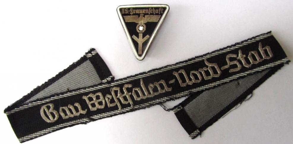 This is a truly awesome - and never before encountered and most certainly very rare! - 'NS Frauenschaft' (or 'NSF') related grouping, comprising of a rare cuff-title executed in 'BeVo'-weave pattern entitled: 'Gau Westfalen-Nord-Stab' and an - also rarely encountered! - enamelled 'NSF'-membership badge (at 'Kreisleitung'-level!), both items in a very nice albeit clearly used and/or worn condition. Both items originated from the same person and were always together as such: they were also found together and most certainly belonged to a female 'NSF'- member that worked at the higher level within the province (ie. 'Gau') named Westfalen. The neat cuff-title (or armband) is executed in greyish-silver linnen on a darker-grey background having two ('flatwire'-like) silver-coloured borders: it is most certainly worn and measures 29 cms. The band - which shows two machine-stitched 'ends' and is IMO full-length - is a tiny bit stained and still shows the stitching ie. thread-remains of having been issued ie. worn. The band came with a neat enamelled 'NSF'-membership badge attached (of which the holes are still visible in the band: nothing shocking though). This badge was intended for a 'NSF Mitarbeiterin im engerer Stab des Kreisleitung', something that can be deducted from the white enamelled border ie. outline around the badge. The badge - which has immaculate enamel without any defaults - is in wonderfull condition and comes on its functional pin-/catch set-up: moreover is it nicely maker-marked on the back and shows a neat marking that reads: 'RzM' - 'M1/109'. A similar piece is figured in the Heering-Hüsken lapel-pin catalogue wherein it is given a unique number (9125NI) and an estimated value of 200 Eu. I could not find any reference for the cuff-title: something that underlines its unquestionable rarity. Simply an awesome an most certainly very rare grouping that belonged to a higher placed official within the 'NS Frauenschaft' (or 'NSF') organisation! I deem that I have priced this - possibly unique! - little grouping accordingly!