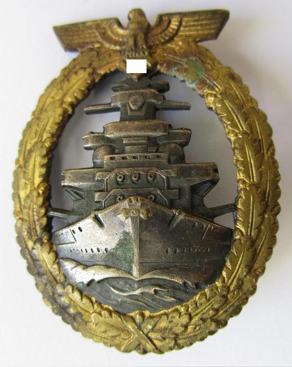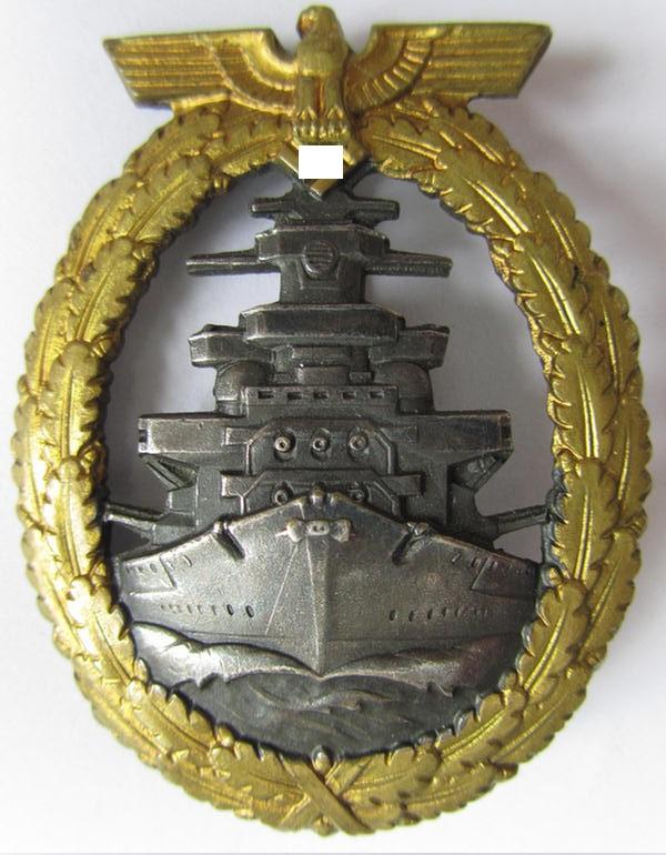 This is a truly very nice WH (Kriegsmarine) 'Flottenkriegsabzeichen' (or high-sea fleet badge), that is nicely maker-marked: 'Fec. Adolf Bock - Ausf. Schwerin Berlin' on the back, in very nice, albeit clearly used ie. worn condition. The very detailed badge retains most of its golden finish and is nicely maker-marked as stated above: it most certainly once had 'hochpolierte Kanten' of which the remains are still visible. The badge is executed in so-called: 'Buntemetall' ie. 'Tombak' and has of course a functional (flute-shaped) pin and catch as to be expected. The badge was most certainly never cleaned nor polished and has truly extraoridinary detail: it is just a bit dusty ie. dirty as recently found. I deem that this example is accordingly priced: it will be difficult to find a more attractive example for a better price!