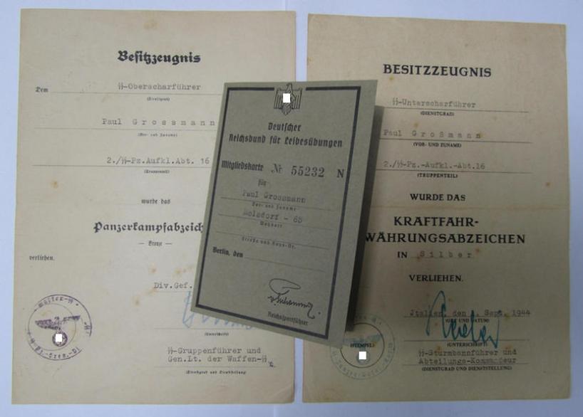 This is truly stunning - and very rarely encountered! - 3-pieced Waffen-SS- (ie. '16. SS-Panzergrenadier-Division' - 'Reichsführer SS'-) related document-grouping, comprising of both the documents for respectively a 'Panzerkampfabzeichen in Bronze' (or bronze PAB) and a 'Kraftfahrbewährungsabzeichen in Silber' (or silver drivers-badge) and more, all as awarded to the: 'SS-Oberscharführer' (= sergeant) named Paul Grossmann, member within the: '2./SS-Pz.-Aufkl.Abt.16', all pieces in a very nice and fully undamaged condition. The grouping comprised of a neat - fairly scarcely encountered and A-5 sized - 'Panzer'-related, award-document (or 'Vorbedrückte Besitzzeugnis'), as intended for a: 'Kraftfahr-bewährungsabzeichen in Silber' (or silver drivers badge), as issued on 1 September 1944 to the: 'SS-Oberscharführer' Paul Grossmann, member within the: '2./SS-Pz.-Aufkl.Abt.16', in overall very nice - albeit used and/or once-folded condition. The document is in a very nice condition overall: it is not denazified nor 'hole-punched' and comes as found: it is just a bit yellowed by storage and/or age. The document was most certainly handed out 'in Italy' (something that can easily be deducted from the typed wording: 'Italien'. It is nicely - and very clearly! - signed by the: 'SS-Sturmbannführer und Abteilungs-Kommandeur' (and member within the: '16. SS-Panzergrenadier-Division' 'Reichsführer SS') named: Walter 'Bubi' Reder (4-2-1915 - 26-4-1991) who was a career-officer who won the Knights Cross of the Iron Cross. He was awarded his Knights Cross (or 'Ritterkreuz des Eisernes Kreuzes') on 3 April 1943 (being at that time an 'SS-Hauptsturmführer' (= captain) and member within the 'SS-Totenkopf'-division). In December 1943 Reder was transferred to the newly formed '16.SS-Panzergrenadier-Division 'Reichsführer-SS'. He remained with this division until May 1945 as a commander of the 'SS-Panzer-Aufklärungsabteilung 16' and/or 'SS-Panzer-Grenadier-Regiment 36'. Both units were also given the task of anti-partisan warfare in Northern-Italy and the former was largely responsible for the infamous Marzabotto massacre; generally regarded as the worst wartime-atrocity in Italy. Allegedly on Reder's direct orders the 'SS-Panzer-Aufklärungsabteilung 16' destroyed the village of Marzabotto in reprisal for the local support given to the partisans and the resistance movement. For this action Reder was convicted to life imprisonment and spent many years in Italian custody. The (A5-sized) document is nicely - and clearly! - ink-stamped (with a stamp that reads 'Waffen-SS - Panzer-Aufklärungsabteilung 16') and is as stated clearly signed by Reder. It should be noted that all Waffen-SS 'Besitzzeugnisse' for the 'Kraftfahrbewährungs- abzeichen in Silber' are not that easy to encounter and can be easily graded 'rare': those signed by Reder even more so! Furthermore there is a neat - fairly scarcely encountered and A-5 sized - 'Panzer'-related, award-document (or 'Vorbedrückte Besitzzeugnis'), as intended for a: 'Panzerkampfabzeichen in Bronze' (or bronze PAB), as issued on 1 October 1944 to the: 'SS-Oberscharführer' Paul Grossmann, member within the: '2./SS-Pz.-Aufkl.Abt.16', in overall nice - albeit used and/or folded condition. The document is in a very nice condition overall: it is not denazified nor 'hole-punched' and comes as found: it is just a bit yellowed by storage and/or age. The document was most certainly handed out 'at the front' (something that can easily be deducted from the typed wording: 'Div.Gef.St.' or 'Divisions-Gefechtsstand'). It is nicely - and very clearly! - signed by the: 'SS-Gruppenführer und Gen.Lt. der Waffen-SS' (and 'Kommandeur' of the '16. SS-Panzergrenadier-Division' 'Reichsführer SS') named: Max Simon (6-1-1899 -1-2-1961), who was a career-officer who won both the Knights Cross and Oakleaves of the Iron Cross. He was awarded his Knights Cross (or 'Ritterkreuz des Eisernes Kreuzes') as early as 20 October 1941 (being at that time an 'SS-Oberführer' and member within the 'SS-Totenkopf'-division) and Oakleaves (or 'Eichenlaub zum Ritterkreuz des Eisernes Kreuzes') on 28 October 1944 (being at that time in command of the '16. SS-Panzergrenadier-Division 'Reichsführer SS'). Simon was the 639th recepient of this highly coveted award. The (A5-sized) document is nicely - and clearly! - ink-stamped (with a stamp that reads '16. SS-Panzergrenadier-Division' 'Reichsführer SS') and is as stated clearly signed by Simon. It should be noted that all Waffen-SS 'Besitzzeugnisse' for the 'Panzerkampfabzeichen in Bronze' are not that easy to encounter and can be easily graded 'rare'. Finally the group holds a small-sized (ie. folded sized 12 x 9 cms.) photo-ID (or 'Mitgliedskarte') for the 'Deutscher Reichsbund für Leibesübungen'. This 1937-dated document holds a (civil) photo of Grossmann. The grouping was recently found at a private household and was never before in a collection. Simply a very nice - and truly rarely encountered! - Waffen-SS-related 'PAB'-/'KFB' related award-document grouping as awarded to an SS-NCO ie. driver and 'Panzer'-soldier, which is of additional interest due to its interesting dates and/or rare signatures!