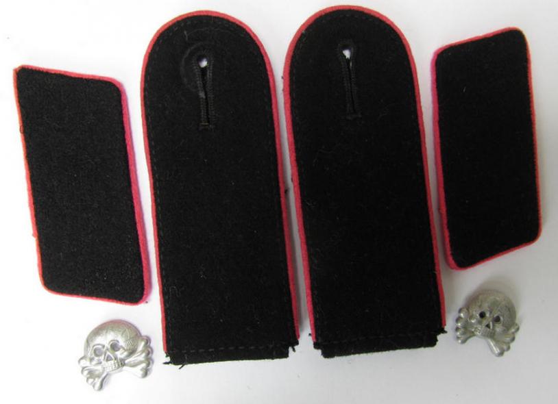 This is a truly stunning - and fully matching and complete! - insignia-set of WH (Heer), early-war period, soldiers-type shoulderboards, collar-tabs and accompanying skulls, as worn on the black 'wrap-around' tunics, as intended for a: 'Soldat der Panzer-Truppen', all pieces in overall very nice albeit clearly used and/or tunic-removed condition. The shoulderboards - which naturally have the black coloured and woolen-based upper-decks - have the specific bright-pink (woolen thus early-type) piping and measure each approximately 11,5 cms. in length. They come on their original tongues and are in a very nice, ie. fully 'text-book' condition overall. The collar-tabs - which naturally also have the black coloured and woolen-based decks and also show the specific bright-pink (woolen thus early-type) piping. They have the ('standard') brownish-coloured so-called: 'buckram-based' backing as to be expected and clearly show the remains of having once a set of skulls attached (they also show the stitching-remains of having once been tunic-attached. The set was found together as such and came with a matching (albeit loose) pair of (aluminium-based) skulls (which both do retain their original, copper-toned prongs and can as such easily be remounted on the collar-tabs. Both shoulderboards and/or collar-tabs show as stated above only minimal usage and or wear (some age, dust and staining is visible and/or present). Simply a superb and matching set of moderately used black-coloured 'Panzer-Truppen' boards and collar-tabs that can naturally easily serve to complete any early- ie. pre-war period 'Heeres' black 'wrap-around' tunic. It is really a very nice and desirable grouping that came directly from a German flea-market and that was never before in a collection: IMO did I price this grouping according to its rarity! Only the first such early- ie. pre-war period 'Heeres-Panzer'-set I ever had on offer!