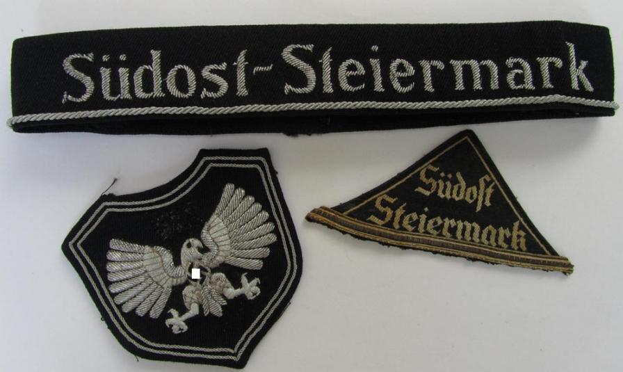This is truly awesome - and very rarely encountered! - JM/BDM (ie. 'Jungmädel'/'Bund Deutscher Mädel') 3-piece cloth insignia grouping, all as intended for a high-ranked: 'Untergauführerin', who served within the Bann Südost Steiermark, all three pieces in a very nice ie. slightly used and/or clearly tunic condition. The grouping comprises respectively of neat (and actually also rarely encountered!) and uniform-removed example of a HJ/BDM ('Hitlerjugend'/'Bund Deutscher Mädel') district-triangle entitled: Südost Steiermark, having a neat originally attached silver-coloured so-called: 'rank-stripe' (signifying HJ/BDM membership before 1933), in overall nice, albeit used and/or worn condition. The triangle misses regrettably its paper 'RzM' etiket (most certainly lost during regular wear) but is in an overall nice albeit clearly worn and somewhat stained/dirty condition. This is of course a 'female' specimen, woven in off-white coloured linnen on a black linnen background. The second item concerns a very nice - and equally rarely encountered! - JM/BDM (ie. 'Jungmädel'/'Bund Deutscher Mädel') hand-embroidered breast-badge, as intended for a 'Untergauführerin'. This neat patch - which shows a period-removed Bann-number as per regulation and is executed on typical, blue-coloured and linnen-based cloth - still retains its original paper-based RzM-etiket (L-Stück). This rare badge - being of the second ie. war-time pattern as introduced in 1943 - is approximately sized: 7,5 x 7 cms. - and comes in IMO slightlty worn condition and simply cannot be upgraded: it has a buckram-based backing as to be expected. The badge is surrounded by two (thin-shaped) stripes of silver-braid, signifying that it was intended for a female member with the (high!) rank of: 'Untergauführerin'. The last item in the grouping is a neat - and equally rarely encountered! - JM/BDM (ie. 'Jungmädel'/'Bund Deutscher Mädel') hand-embroidered, officers-type cuff-title (or Ärmelstreifen) entitled: Südost Steiermark. This neat armband is also executed on typical, blue-coloured and linnen-based cloth and shows only one stripe of silver braid (attached on the underside, as per regulation). It also still retains its original paper-based RzM-etiket (J-Stück). The armband is in truly wonderfull condition and was clearly tunic-removed (signs still visible). It is in full-length (ie. 42 cms. long-sized) condition and has been period stitched-together. As stated where all three rare items worn by the same women and originate from a private household: They were never before in a collection. The details and craftmenship shown on both pieces of hand-embroidered youth insignia are simply stunning and very pronounced. Simply a very nice and unusal grouping of rare BDM-items that is offered by me for the first time!