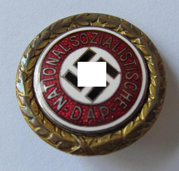 This is a truly stunning, example of a: 'Goldenes Ehrenzeichen der N.S.D.A.P.' (or golden honorary N.S.D.A.P. membership-pin/party badge), being of the smaller variant (or: 'kleines Abzeichen für den Zivilanzug'), as intended for the civil attire, which is nicely marked on the back: 'Deschler - Muenchen' and which is uniquely numbered: '39096', in overall very nice, albeit issued and sligthly worn, condition. The badge - which has an approximate diameter of 24 mm. as always - has a nice age patina and has IMO never been cleaned nor polished. The neat little badge is showing some normal wear but has truly no enamel damage whatsoever (it is just a tiny bit dirty as more often) and shows a fully preserved golden-toned finish on the back (just the front-side rim shows some minimal wear). This example - which has a bright-red coloured enamelled area - comes on its regular 'pin/catch' set-up (which is naturally still fully functional and present). Simply a very nice and original, smaller-sized 'Goldenes Ehrenzeichen der N.S.D.A.P.': only the first such neat example I ever had on offer!