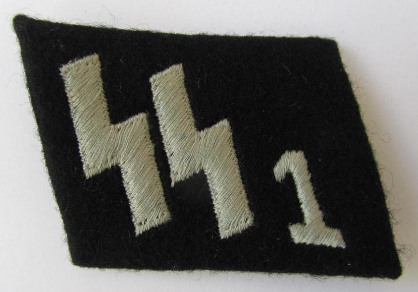 This is a truly stunning example of an early-war type 'SS-VT' (or 'SS-Verfügungstruppen') so-called: 'RzM-style' soldiers'-/ie. NCO-pattern collar-tab, as intended for usage by soldiers within the 'SS-Standarte' Deutschland that still retains its original, paper-based 'RzM'-etiket, in overall very nice (ie. mint-/unissued!) condition. The neat piece was IMO never tunic-attached and shows a standard-type brown-coloured (ie. 'buckram'-based) backing. This tab - which is executed in the smooth-type so-called 'moleskin' wool - is IMO a text-book example of a so-called: 'numbered'-type runes' collar-tab: next to the runes it shows the machine-stitched 1 numeral, signifying that it was a tab as intended for a soldier within the 'Standarte' ie. 'Regiment' Deutschland. The piece has as stated never been worn and shows some minimal age ie. staining caused by decades of storage only. Simply a very nice and 100% guaranteed original SS 'numbered' runes-tab: only the first such desirable and very rare piece I ever had on offer!