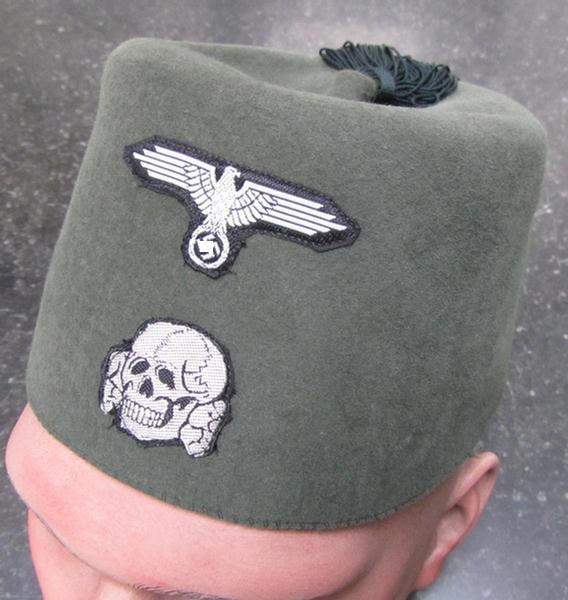 This is a truly superb - and rarely encountered! - example of a field-grey ie. green-coloured and woolen-based Waffen-SS so-called: 'Fez', having neat - and matching! - silver-grey coloured 'BeVo'-insignia originally attached, in overall very nice (IMO mint-/unissued!) condition. The nice and desirable piece - which is fairly sized and will fit any mannequin - has a complete and nicely shaped, dark-green coloured 'Tassel' and is void of any wear nor damage. The bluish-grey coloured (leather-based) sweatband is void of any marking (as is more often observed). Both - naturally fully matching - BeVo-type insignia are originally (ie. 'off-factory') applied (by machine-stitching using green- ie. black coloured thread). Of specific interest is the fact that this example shows a (highly desirable!) larger-sized skull ('Totenkopf') attached. These neat and unusual head-gear pieces were intended for the Waffen-SS volunteers in the later-war SS-divisions such as the: '13. Waffen-Gebirgs-Division der SS' Handschar (or 'kroatische Nr. 1'). This piece originates almost certainly from the 'Dachau'-depot from where it was taken as a 'war-souvenir' by a US soldier in 1945. It should be noted that these field-grey ie. green-coloured examples are said to be intended for front-usage (whereas their maroon-coloured counterparts were more intended as dress-headgear). In any case are these field-grey ie. green-coloured examples much harder to find and can be easily graded 'rare' and desirable. This is also the first such neat example I ever had on offer. Simply a very nice and decorative piece of genuine Waffen-SS headgear: simply impossible to upgrade this example!