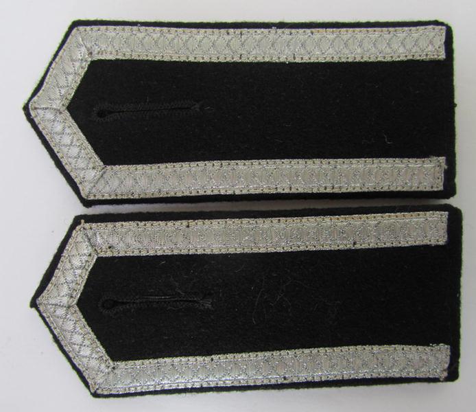 This is a truly very nice - and fully matching! - pair of (IMO early ie. mid-war period), white-piped Waffen-SS NCO-type shoulderboards, as intended for a: 'SS-Hauptscharführer der Infanterie' (infantry sergeant first-class), in overall very nice, albeit sligthly used and/or minimal worn condition. The boards have the neat and very desirable (white-coloured) 'silk-like'-type piping, show a black-coloured upperdeck and black-coloured-woolen underlay and have the standard silverish-grey toned NCO-braid attached. The set comes on its functional tongues and measures approximately 10,5 cms. sized in length. The set - which originates from my own shoulderboard collection - was IMO only slightly used: it shows some truly minimal wear and age and is minimally stained. The set - which I personally found at a private house-hold several years ago - is in truly wonderfull condition and can almost not be upgraded. Both boards show two identical (aluminium-based) pips attached, denotoing the rank of: 'SS-Oberscharführer'. The boards each show a damaged area on the underside: here a small piece of cloth is removed (something that is completely done without a reason I can think of: this is however not visible from the top and IMO not that disturbing). As most certainly known are all Waffen-SS NCO-type boards to be considered rare and very hard to encounter: those matching pairs, piped in white (Infanterie) having attachad tongues even more so! Simply a very nice and desirable pair of Waffen-SS infantry boards in a truly wonderfull condition: only the first such rare and desirable set I ever had on offer!