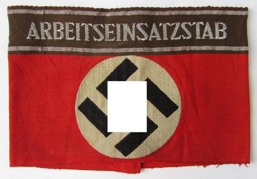 This is a truly superb - and actually extremely rarely encountered! - example of an officers-type RAD- (ie. 'Reichsarbeitsdienst'-related) armband entitled: 'Arbeitseinsatz- stab' (or labour mobilisation-staff), in overall very nice ie. moderately used ie. worn condition. These armbands were worn on the uniforms used by the staff of the - in March 1942 - newly founded (and RAD-related) administrative organisation named: 'Arbeitseinsatzverwaltung' (or 'AEV' ie. labour mobilisation administration). Although already founded in 1942 the 'AEV' started functioning as late as December 1943. There is only little (to nothing!) known about this obscure - and most certainly very small-sized - TR-organisation. It is assumed that its members wore 'earth-brown'-coloured and specifically designed 4-pocket-tunics (and/or great-coats) which were presumably similar to the mustard-coloured officers'-type 'RAD' tunics and wore armbands (on the left-upper arm) as the example on offer here. The armband - which is of the neat officers'- ie. 'flat-wire'-woven type - is neatly executed in the so-called: 'BeVo'- ('flat-wire') weave technique in silver-coloured braid on a darker-brown-coloured (linnen-based) background and is assembled TOGETHER with the also 'entirely'-woven swastika-type armband (something that is really unsual!). The armband is IMO clearly issued and worn and does show some minimal staining ie. wear: a tiny part of the stitching (with which it was attached comes loose but nothing shocking). Simply a great occasion to acquire a an extremely rarely encountered example of an officers-type RAD- (ie. 'Reichsarbeits- dienst'-related) armband entitled: 'Arbeitseinsatzstab'. I am pretty sure that this will be the only such example I can ever offer!