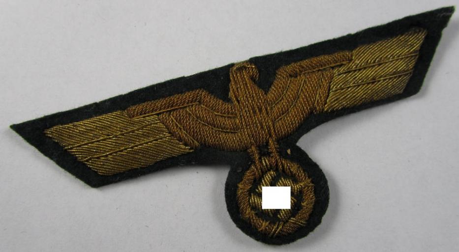 This is a truly stunning - and actually rarely encountered! - WH (Heer) general-officers'-type breast-eagle, which is very nicely and expertly hand-embroidered by using multiple coloured golden-toned braid, in overall very nice, (IMO mint-/unissued!) condition. The eagle is neatly hand-embroidered by using various types ie. shades of golden-toned braid and is nicely 'backed' with thin-shaped and/or black-coloured paper (as is more often encountered). The hand-embroidery on this example is so nice that I have absolutely no doubts whatsoever that this is a genuine WH (Heeres) general-officer breast-eagle and not a (simillarly styled) WH (Kriegsmarine ie. 'Küstenartillerie') officers-type breast-eagle but as surely known can this not be fully confirmed: both are as surely known similar in style and/or execution. The golden colour has somewhat tarnished from normal aging and/or wear but the piece still retains extraordinary detail. It is executed on dark-green coloured wool. The piece was never before in a collection and originates from a private house-hold where it was recently found: it came together with the neat visor-cap eagle which I offer under number: 28790. Simply a truly very nice 'general-officers-type breast-eagle that is nowadays not that often offered for sale!