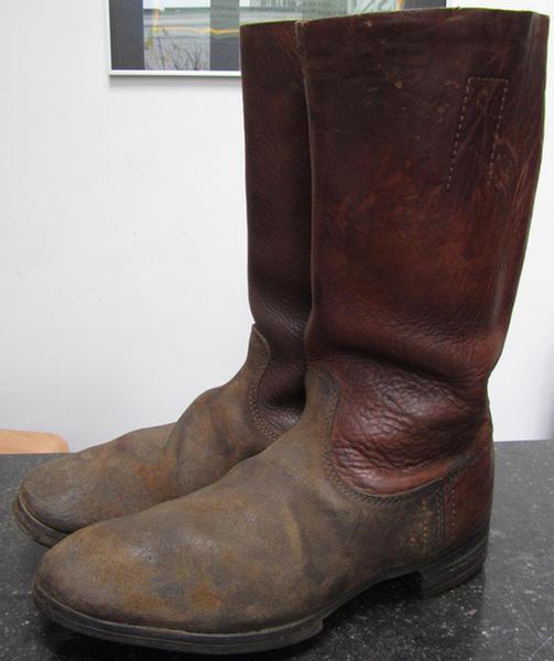 This is a truly beautiful - and nowadays rarely encountered! - pair of brownish-/natural- coloured, leather-based WWII German boots (or 'Marschstiefel' ie. 'Knobelbecher'), sized: '31,5' and nicely maker-marked on the shafts: '31½ 5 42 55', in overall very nice albeit slightly used ie. worn condition. The pair - which is fairly large-sized and will as such easily fit any mannequin - shows some normal dust and/or moderate aging: the leather, however, is very souple and fully functional. All iron parts (like the hub-nails) are a tiny bit rusty but all present and in place. The boots are also neatly marked (ie. ink-stamped) on the inside, but this hard to read ie. decypher. Also the soles show a neat size- and/or maker marking. The pair - which measures 36 cms. in height - has never been heavingly greased nor oiled and still retains a somewhat hardened touch. These boots are the 'real thing' and NO Eastern-European or post-war copies and I back this up with a life-time garuantee on the originality. Needless to mention how rare period German foot-wear actually is: mainly because these where also used after the war as 'regular' footwear, something that merits IMO my asking price. (Please note that these are quite expensive to ship: you can preferably mail me in advance to discuss this in detail). Simply a very nice and text-book pair - that orginates from a German private house-hold - that would look super if re-mounted on a mannequin!