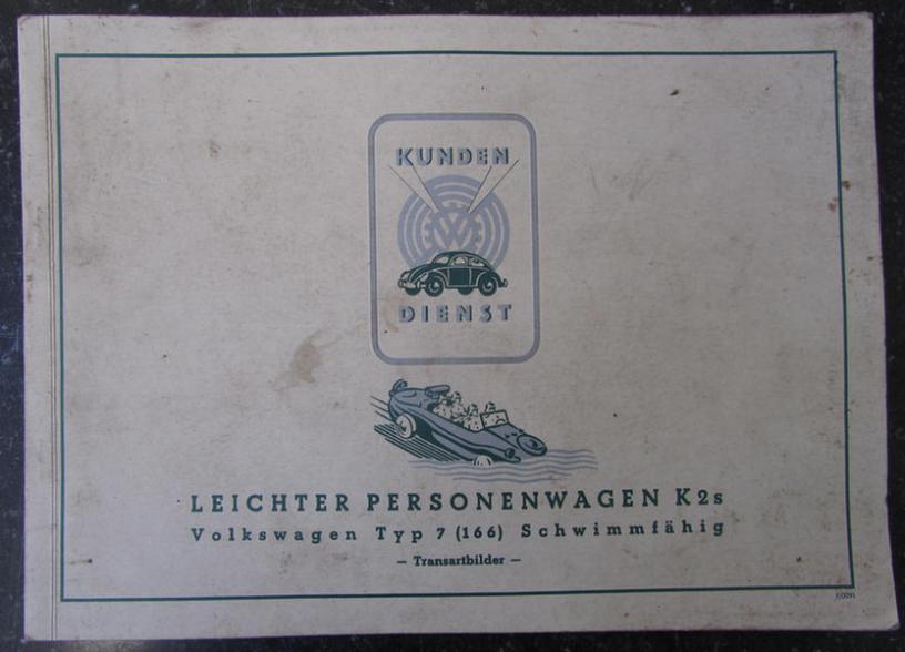 This is a truly very nice - and extremely rarely encountered! - WWII-period (ie. 1943-dated), so-called: 'Transartbilderbuch' (ie. booklet with transparent plates) as issued by the VW (ie. 'Volkswagen') 'Kundendienst', as intended for the: 'Leichter Personenwagen K2s' (ie. Volkswagen Typ 7 (166) Schwimmfähig' (better known as: 'Schwimmwagen') dated: 24 September 1943, in overall very nice and fully complete condition. This is the 'smaller' version that measures 30 x 22 cms. (just showing the entire vehicle and most of its technical parts) that only helds one (ie. two folded-out paper pages) and 4 (ie. double-sided thus actually 8) transparencies or ('Transartbilder'). These extremely rarely encountered (and thus very desirable!) booklets were only disseminated at a very limited scale and saw only usage at central 'Deutsche Wehrmacht' repair-points and/or military garages. The booklet on offer here shows some minimal age and or staining: IMO simply caused by moderate usage. I do know that this item is expensive but I have seen similar publications sold on auction-sites for the double of my asking-price! Simply a really awesome and very special WWII vehicle-related item: ony the first such item I ever had on offer!