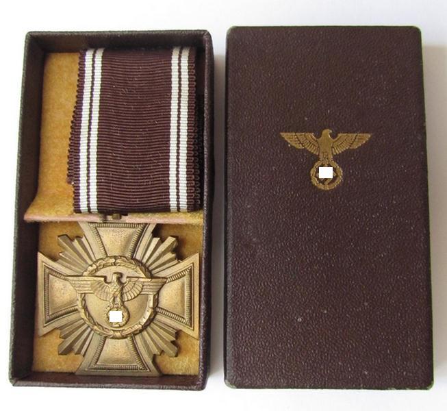 This is a very nice, so-called 'light-weight'-verison of a 'N.S.D.A.P.-Dienstauszeichnung in Bronze' (ie. '3. Stufe für 10 Jahre treue Dienst') that is neatly maker-marked in the ring with the makers-signification: '15' and that comes in its original (also maker-marked!) carton box ie. etui as issued, in overall very nice (IMO almost stonemint-/unissued!) condition. The neat - and very detailed! - medal comes together with its period and/or full-length (ie. 25 cms.!) long, non-confectioned and/or folded ribbon as issued. The medal has IMO never been cleaned and retains most of its truly bright-coloured 'bronze' (ie. bright golden-toned!) finish: it still has great pronounced detail. This is a so-called: 'Leichte Ausführung' (light-weight version) executed in zinc-based metal ('Feinzink') that was normally intended for men. As stated is the medal stamped with the makers-signification: '15' in the ring (signifying that it is a piece that was produced by the: 'Friedrich Orth' company based in Vienna/Austria). The piece came in its (chocolate-brown coloured carton box (ie. etui) that shows a neat (and undamaged) golden-toned eagle-device on the top and is moreover (darker red-) ink-stamped on the back with the signification: 'RzM M1/34'. The box retains all its yellow-coloured, 'velvet-like' inner-lining and just shows one tiny damaged area on the bottom (see photos). Simply a very nice example of a desirable complete 'N.S.D.A.P.-Dienstauszeichnung'!