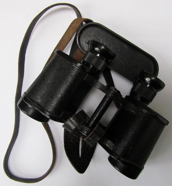 This is a stunning and honest piece of equipment: a truly very nice example of the 'standard-type' WH binoculars 'Dienstglas - 6 x 30' that comes with all its period mounted and desirable 'accesories' in full working- and completely 'untouched' order. The pair comes fully complete as found and stored for decades: it is mounted on its black-brownish leather carrying strap as found (and has undamaged 'Bakelite' eyecups) and is in a truly very nice condition overall having almost all of its original black (ie. fairly shiny) colour remaining. The piece is however slightly used and shows minimal traces of wear and age (it is also still a bit dusty ie. dirty). The right-hand side top is neatly marked with a 3-digit code: 'DDX' (signifying that it is a later-war produced piece by the 'Voigtländer' company). It also has the (undamaged) inscription: 'Dienstglas' and bears the additional inscription: 'KF' (or 'Kalte Fest') implying that the piece could also be used in artic- ie. below-zero circumstances. The piece is completely clear of sight and sharp and would even serve as a 'day-to-day' usable pair of binoculars. The piece came as a complete set and also retains its (IMO) later-war-period (black-coloured) leather-based so-called: 'anti-movement' slip, which is in itself a rarely encountered item (the piece is fully souple and functional). Also is the neat 'Bakelite'-based lense-protector present (showing a neat 'WaA'-stamp!). Moreover comes the piece with all its 'snaps' as it left the factory (something that is not that often encountered). Simpy a very nice and honest piece of equipment, which is actually quite hard to find in this nice and fully compete condition!