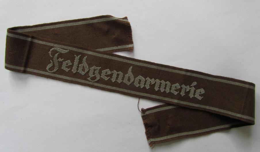 This is a very nice example of a - truly scarcely encountered! - 'standard-type' WH (Heeres) cuff-title executed in neat 'BeVo'-weave pattern, entitled: 'Feldgendarmerie' (ie. field-police), in overall very nice albeit clearly used and/or tunic-removed condition. The 'BeVo'-woven armband is executed in bluish-grey coloured linnen, interwoven on a rust-brown coloured (equally linnen-based) background. The neat piece - which is almost full-length and measures in total approximately 40 cms. in length - shows two unfinished ends as more often encountered. The piece was clearly worn and shows some age and/or minimal staining and shows IMO the signs of having been once tunic-attached. It should be noted that the example on offer here is actually a variant-type that differs from the more usually encountered FG-cuff-titles: this example is woven differently and can be compared with the (very rare!) rare Waffen-SS cuff-titles: "Hitlerjugend", "Danmark" and/or "Norge". Simply a very nice and surely not that often encountered cuff-title as used by a (notorious!) 'Feldgendarmerie' (field-police) staff-member: only the first such neat piece in this pattern I ever had on offer!