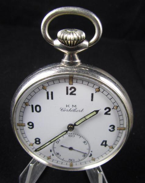 This is a truly very nice - and rarely encountered! - WH (Kriegsmarine) WWII period pocket-watch (or also known as 'Beobachtungsuhr') of the make: 'KM Corthébert', having a white dial-plate and neatly engraved (serial-) number on the back that reads: '541446', in overall very nice and fully functional condition. These service watches - having a standard 15 jewel movement - were distributed at a very small scale to the various soldiers (ie. NCO and officers!) of the 'Kriegsmarine' ie. 'Deutsche Wehrmacht' and were properly entered in both 'Wehrpass' and/or 'Soldbuch'. They had to be engraved with a numbering on the back (as is this example). As stated above has the piece on offer here a white (and undamaged) dial having a subsidiary 'seconds'-dial at the 6 oclock position. The piece has a nice (and almost undamaged) casing (which is executed in nickle-silver metal): it just shows some minimal wear and age, simply caused by moderate wear and/or age. As stated is the piece fully functional and in running condition. Simply a very nice and truly rare piece: only the first such item I ever had on offer!