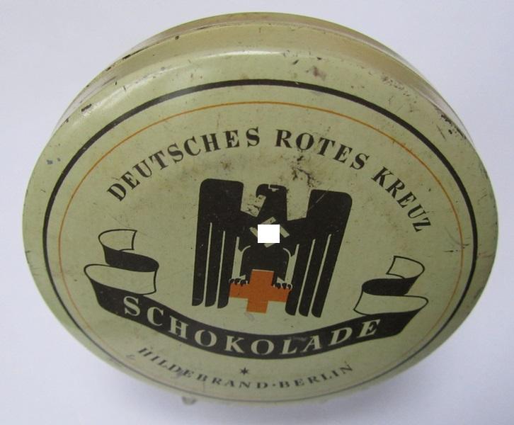 This is a truly very rare - albeit regrettably empty! - chocolate ration-tin (ie. tinnen-based box or ration-tin) as issued by the WH ie. DRK (or: 'Deutsches Rotes Kreuz'), neatly marked: 'Schokolade' and/or produced by the: 'Hildebrand'-company based in Berlin, in overall very nice, albeit clearly used ie. issued condition. This chocolate was a by the German troops much loved 'special ration' of high-energy sweets, used as 'emergency food' at the front. The tin is in overall nice but clearly used condition (albeit empty) and has no real damage, dents or alike (almost all colour is present but some normal usage-areas ie. scratches are visible). These tins can be compared with the neat - although more commonly encountered! - orange-coloured: 'Sho-Ko-Kola - Wehrmachts-Packung' ration-tins (which have the same format). Needless to say that these decorative 'DRK' examples are x-times as rare as their more commonly encountered counterparts. Just the first such very rare and desirable item I ever had on offer!
