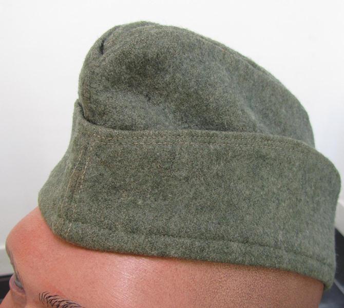 This is a truly very nice - and actually quite rarely encountered! - example of a genuine, period field-grey coloured Waffen-SS side-cap (or 'Schiffchen') which is nicely size-stamped (black coloured ink-stamp that simply reads: '55') and that is personalised by the bearer (impossible to decypher but most certainly present), in an overall very nice, albeit clearly used ie. worn condition. The cap is truly 'text-book' in all facets, shows no damage whatsoever and is in great shape overall (almost all woolen nap is present). The cap regrettably misses both its insignia (minimal traces are however visible and/or present). The greyish-beige coloured and/or linnen-type lining is also fully textbook and bears a nice and clear size-stamp as stated above: it also shows an inked name (most certainly of the bearer) which is visible but impossible to decypher. The - nicely 'banana-shaped' side-cap is naturally a true piece of genuine Waffen-SS headgear and shows as stated above all details as to be expected. The cap - which is nicely sized and will fit any mannequin - only shows some minimal age ie. staining and was clearly used and/or worn. The piece just needs a set of (BeVo-woven) insignia to complete. Simply a very nice and only moderately used Waffen-SS side-cap which is IMO accordingly priced!