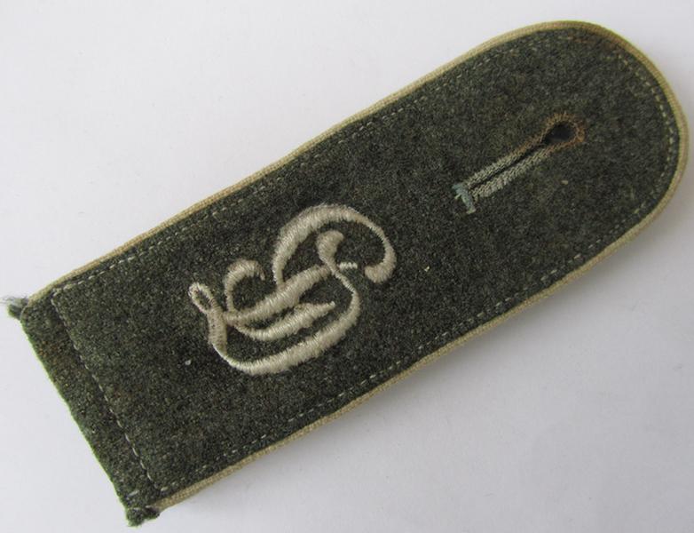 This is a very nice - and rarely encountered albeit regrettably single! - field-grey coloured, white-piped and/or 'cyphered'-type shoulderboard (rounded model) piped in the white-coloured branchcolour as intended for a simple 'Soldat' (ie. soldier) that served within a regiment within the famous 'GrossDeutschland' division, in overall nice, albeit clearly used and/or worn condition. The neat shoulderboard - which measures 11,5 cms. in length as has the woolen-type piping - is as stated clearly used and/or worn (some obvious staining and/or usage is present and/or visible) but comes on its functional tongue. It originates from a private household and was never before in a collection. Simply a very nice and truly scarce- and desirable shoulderboard from an infanterie-soldier that served with the famous WH 'elite' 'GrossDeutschland' regiment!