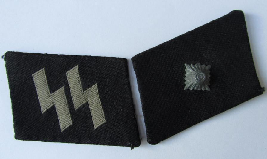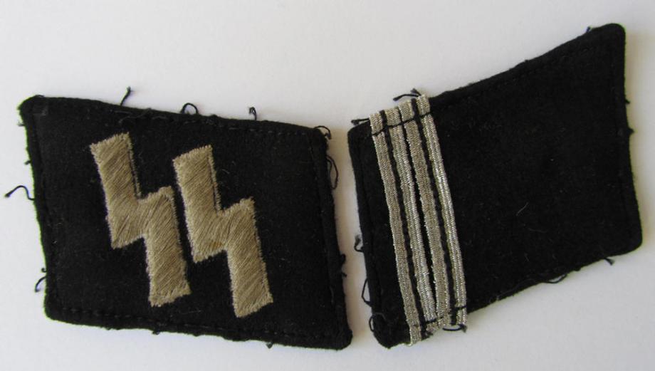 This is a truly rarely encountered Waffen-SS 'BeVo'-style collar-tab set, comprising of a runic tab and very rare rank-tab, both in a nice, albeit clearly used ie. worn and obviously tunic-removed condition. It should be noted that the ('BeVo'-style) black linnen rank-tabs are x-times scarcer than their runic counterparts and are almost impossible to encounter. Both tabs have the beige-couloured, carton backing as more often observed. I know that this set is highly priced but it should be noted that in 30 years of collecting, I have only encountered a handfull such (matching) sets. Both tabs were IMO clearly used and are in a used and tunic-removed condition as stated above (the thread-remains ie. holes are still present and visible). This set - which is matching in all detail - was found together as such and I will not separate them and therefore only sell them as a set. The runic-tab shows one (centrally attached) zinc-based pip, denoting that this set was worn by a Waffen-SS NCO ie. 'SS-Scharführer'. A truly nice and rare Waffen-SS NCO rank-tab set: only the first such NCO-set I ever had on offer!
