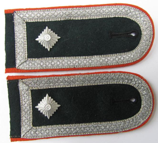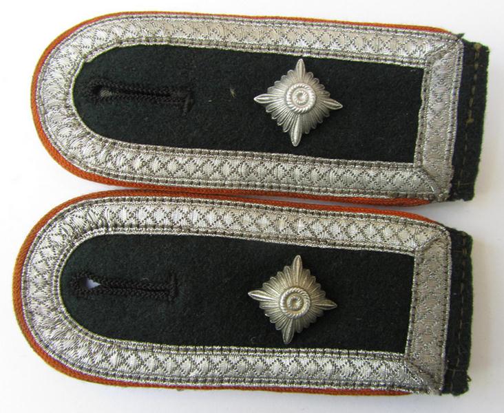 This is a truly very rare - and fully matching! - WH (Heer) IMO early- (ie. pre-) war period, NCO-type shoulderstraps, as intended for a: Feldwebel der Feldgendarmerie (= sergeant within a field-police unit), in overall very nice, albeit slightly used and/or most certainly worn condition. The straps are executed in dark-green coloured (smooth-type) wool and have the 'rayon'-type, bright-orange coloured, piping attached (signifying Feldgendarmerie- or eventual Academy-usage). The boards - which come mounted on their standard-type tongues - measure 11 cms. in length each - and have the standard, silverish-coloured Heeres NCO-braid attached and show (identical!) silver-coloured (aluminium-based) pips attached (signifying the rank of Feldwebel). The set is IMO only slighty used and shows moderate ie. normal wear and/or age. It should be noted that matching pairs of orange-piped, 'Feldgendarmerie' shoulderboards are very desirable and very rarely offered for sale. This is the opportunity to acquire a text-book-set in an overall great condition: only the fourth such set I ever had on offer!