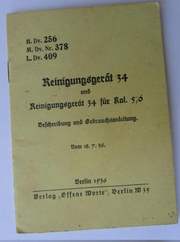 This is a superb example of the truly very rare and scarcely encountered WH instruction-booklet, entitled: 'Reinigungsgerät 34 - Beschreibung und Gebrauchsanleitung' (= instruction-/training manual for the standard K98 cleaning-kit), in overall very nice and only slightly used condition. The small-sized booklet - sized: 14,5 x 10,5 cms. - is fully complete and retains all its 32 pages and fold-out small-sized, poster ie. Tafel (which is often missing). The light-yellow-coloured booklet is just somewhat stained caused by normal age and years of storage. The fold-out Tafel is naturally present and fully undamaged. As possibly known has also this rare booklet been reproduced: this is naturally a fine original and period example! The booklet provides the reader with text and some illustrations and provides the reader with a complete insight on properly using the standard WH cleaning-kit numbered RG34 all its accesoiries. These publications were not 'standard'-issue but had to be privately acquired by the soldiers ie. NCO's and/or officers. Simply a nice and extremely rare period publication: it is just the first such piece I have ever seen ie. encountered. A truly great addition to any field-gear/mannequin set-up or period WH publication collection!