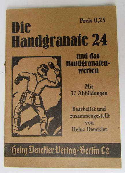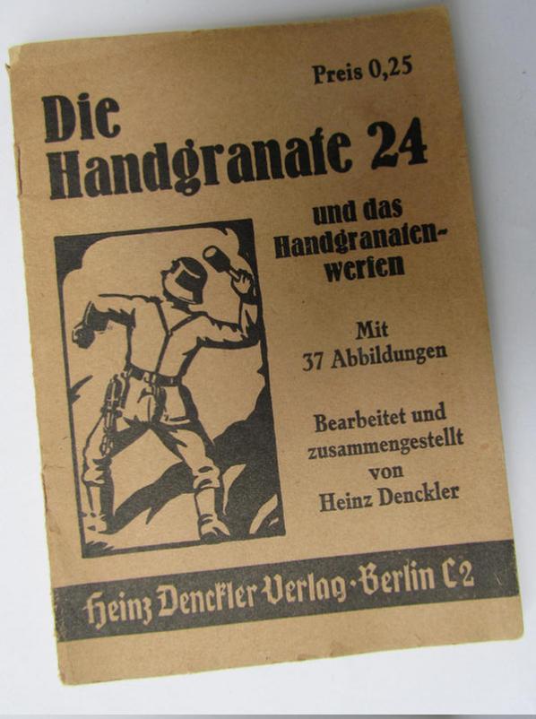 This is a nice example of the truly rarely encountered WH instruction-booklet, entitled: 'Die Handgranate 24 und das Handgranatenwerfen' (= instruction-/training manual on the hand-grenade M24 and its usage), in overall very nice and only slightly used condition. The small-sized booklet - sized: 14,5 x 10,5 cms. - is fully complete and retains all its 30 pages. The yellowish-/creme coloured booklet is just somewhat yellowed caused by normal age and years of storage. As possibly known has also this rare booklet been reproduced: this is naturally a fine original and period example! The booklet provides the reader with text and 37 (!) illustrations and provides the reader with a complete insight on properly using the standard WH hand-grenade M24. These publications were not 'standard'-issue but had to be privately acquired by the soldiers ie. NCO's and/or officers. Simply a nice and rare period publication: it is just the first such piece I have ever seen ie. encountered. The booklets'-cover comes a bit loose: but nothing too shocking. Simply a truly great addition to any field-gear/mannequin set-up or period WH publication collection!