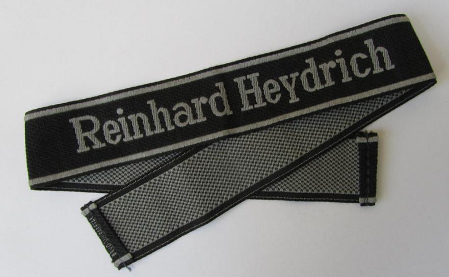 This is a very nice - and naturally 100% original! - 1943/44 pattern, Waffen-SS cuff-title depicting the machine woven Latin script in silver-grey linnen, as intended for a member of the SS-Gebirgsjäger-Regiment 6. (u. 11.) 'Reinhard Heydrich, in overall very nice ie. stonemint/unissued condition. The full-length cuff-title (approx. 48/49 cms.) has the typical 'salt & pepper' reverse and shows all details of an original, period specimen. This band was produced by the 'Bandfabrik Ewald Vorsteher'(BeVo) in Wuppertal and shows the interwoven company name on one of the ends (something that is not always the case). This cuff-title is a 100% text-book - and as stated above - original example that originates from a US-veteran who liberated this piece in 1945. The piece shows some really minimal staining and age and was never worn nor tunic-attached. A great opportunity to acquire a nice and rarely encountered Waffen-SS BeVo-type cuff-title for a competitive price!