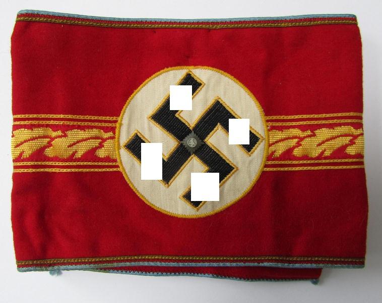 This is a truly stunning example of a rarely encountered NSDAP-type, woolen-based armband (ie. Armbinde), as intended for a NSDAP Blockleiter at Ortsgruppe-level, still retaining its original, paper-based RzM-etiket as issued, in very, nice (IMO mint-/unissued!) condition. The neat piece - which is constructed from smooth-type ie. moleskin-type wool is in a wonderfull condition overall : it is in full-length condition (and measures 53 cms. in length) and was never sewn together. It shows two unfinished ends as is common for these armbands. As stated does the piece also still retains its original, paper-based RzM-etiket (F-Stück) and is also (white-ink) stamped with the signification: Oben (denoting in which direction it should be worn on tunic or great-coat). The piece can easily be identified as an NSDAP-armband intended for an NSDAP Blockleiter at Ortsgruppe-level due to the presence of the light-blue (rayon-like) piping and single golden-toned (bullion) sub-colour ie. second piping: moreover has it the (obligatory) zinc-based pip attached (in the centre of the swastika). The piece was IMO never worn but originates from the US where it was brought as a veteran-bring-back-item: it shows some (truly non-disturbing) holes from having once some tinnies or badges attached (see photos 3 & 5). In any case is this a fairly highly ranked NSDAP-armband that is scarcely encountered and that is not often offered for sale. Only the first such neat NSDAP-related item I ever had on offer!