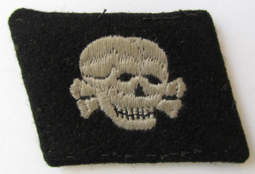 This is a truly stunning example of an early-type SS ie. Waffen-SS so-called: 'RzM-style' collar-tab, as intended for usage by soldiers of one of the SS-Totenkopf- standarten (and/or 3.SS-Panzer Division 'Totenkopf'!), depicting the horizontal deaths-head ie. skull, in overall very nice ie. clearly used and/or tunic-removed condition. The neat piece comes as stated in tunic-removed condition (remains of the machine-stitched attachment are present and visible) and shows a standard-type brown-coloured (buckram-based) backing (which shows the remains of its paper-based RzM-etiket). This tab - which is executed in smooth so-called 'moleskin' wool - differs in some minor details with the (much more common!) so-called: 'Dachau'-type TK collar-tabs and is a neat and more early produced collar-tab. The piece - which originates from my own private collection - has clearly been used ie. worn and shows minimal signs of moderate wear and/or age. Simply a very nice and 100% guaranteed original TK tab!