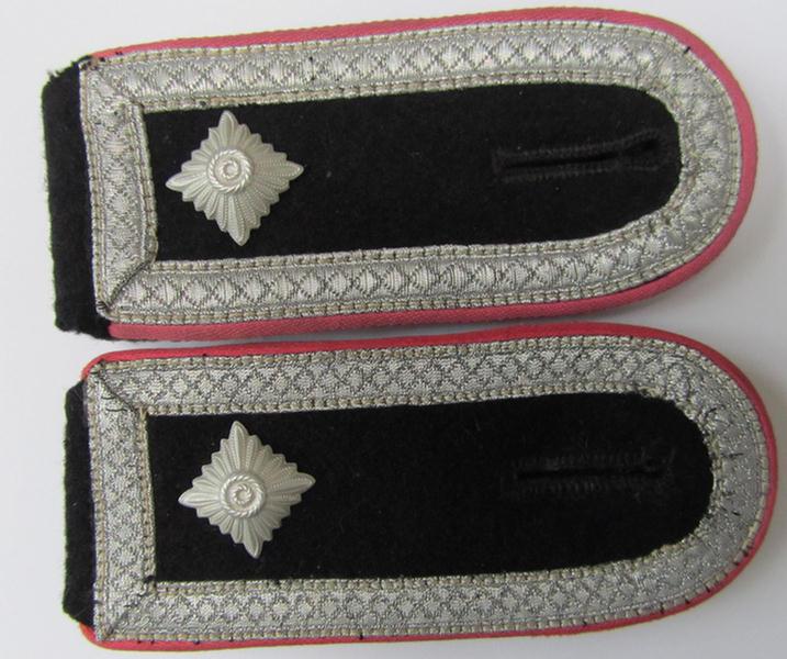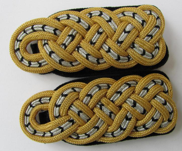 This is a truly superb - and actually very rare! - fully matching pair of RAD (ie. Reichsarbeitsdienst) general-officers shoulderboards (of the second- ie. third pattern), as intended for a RAD-Generalarbeitsführer, in very nice, IMO only slightly used ie. worn condition. The shoulderboards - which each measure 10,5 cms. in length - are constructed from a combination of multiple-coloured (Celluon-based) braid and have a black-coloured (velvet-based) underlay (as per regulation). The pair on offer here had never any pips attached, signifying that it was used by a RAD-General holding the rank of: RAD-Generalarbeitsführer. The set - which is executed in a very luxurious manner and comes on its functional (also velvet-based) tongues - is IMO only slightly used and only shows truly minimal age ie. wear. It should be noted that these rare shoulderboards are almost never offered for sale. Only the first such pair I ever had on offer!