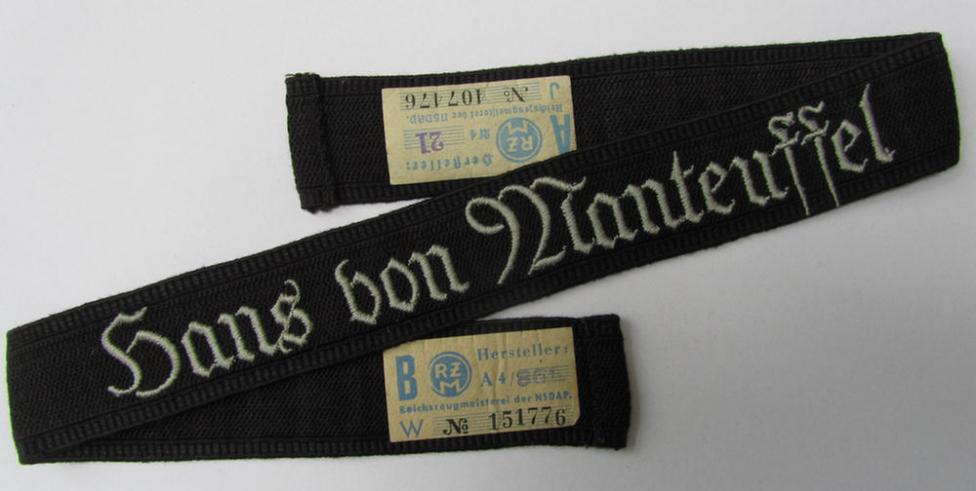 This is a very decorative and fairly scarcely encountered, SA ('Sturmabteilung') honorary-cuff-title entitled: 'Hans von Manteuffel', as intended for a member of the 'Gruppe Warthe' (WA), still retaining both its originally attached, paper-based 'RzM'-etikets, in very nice (IMO mint-/unissued!) condition. The black-coloured - and linnen-based - armband ie. cuff-title measures approx. 48 cms. in length and is as stated above in absolute mint-/ie. unissued condition. The piece - which shows the (Gothic-style) text woven in silver-greyish linnen on a black (also linnen-based) background - was as such bestowed on certain SA-members that served within the province Warthe (ie. Gruppe Warthe / Standarte Posen). I have seen these SA-honorary cuff-titles for the double as my asking price. Simply a very nice and unusual piece of SA-related insignia that simply cannot be upgraded: just the first such rare cuff-title I ever had on offer!