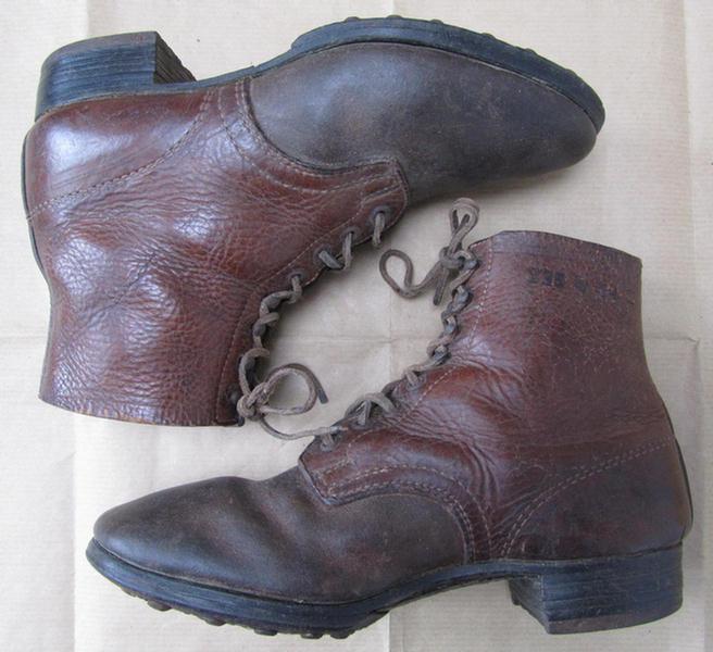 This is a truly beautiful - and very rarely encountered! - brown- (ie. natural leather) coloured pair of matching WWII German low-boots (Halbshuhe), in overall very nice ie. clearly issued and/or worn condition. The pair is most certainly fairly used and shows some normal wear and aging as to be expected: the leather, however, is overall very souple and of course fully functional. All iron parts (like the hub-nails and heel pieces) are a tiny bit rusty but present (five hub-nails are however missing and so is one of the top lace-adjustment clips, something that is IMO not that shocking). Of additional interest is also the fact that the boots retain their (originally mounted and nicely preserved!) leather-based laces. The boots are neatly marked: '27 5 444 2' and 11 on the (inner) sides (as it should be): the are IMO a fair sized (ie. 41/42 European sized pair) that would easily fit a mannequin. The a.m. stamps are clearly present but a bit hard to decypher. Also the inside of the soles ie. shoes shows a size marking. The outsides of the soles have naturally a 'rounded'-shape (being an important characteristic of their originality). The pair has never been cleaned nor (recently) polished and comes as found by me. These are the 'real thing' and are NO Czech or post-war copies and I naturally will back this up with a life-time garuantee on their originality. Needless to mention how rare period German foot-wear actually is: mainly because these where also used after the war as 'regular' foot-wear. A very nice and fully text-book pair that would look awesome if mounted on a mannequin! Only the second such pair I ever had on offer!