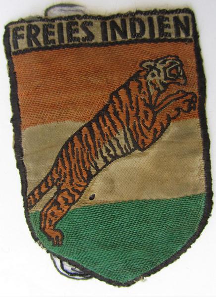 This is a truly superb - and ultra rarely encountered! - WH foreign-volunteer arm-shield, executed in neat 'BeVo-weave' pattern, as issued by/for the 'Provisorische Regierung Azad Hind' / 'Freies Indien', in overall very nice, albeit clearly used ie. tunic-removed condition. The fairly large-sized (ie. 9 x 6 cms. sized-) volunteer-shield depicts the jumping tiger symbol on a orange-white-green shield and was worn by the various staff (foreign- and German!) of this small and obscure German WH unit. The 'Legion Freies Indien' / 'Azad Hind', or the Indian Legion, variously known as the Tiger Legion, the Free India Legion (in English), the Azad Hind Legion, and the Indische Freiwilligen-Legion Regiment 950 or the I.R 950 (Indisches Infanterie Regiment 950) was an Indian armed unit raised in 1941 attached to the Wehrmacht, ostensibly according to the concept of an Indian Liberation force during World War II by Subhash Chandra Bose in Germany. Of additional interest is also the fact that these units were stationed in both occupied Holland and/or France. The shield on offer here was truly worn and tunic-removed: it is still a bit dirty ie. stained and shows the clear evidence of having been worn: it also shows one tiny hole. I have seen a similar example being sold for over 2000 Euro, something that IMO merits my (high) asking price. This is the first- and almost certainly only! - example I can ever offer for sale: I deem that only a handfull of these very rare insignia have survived ie. are in collections today. Simply one of the most desirable and rare 'foreign volunteer' items in existance today!