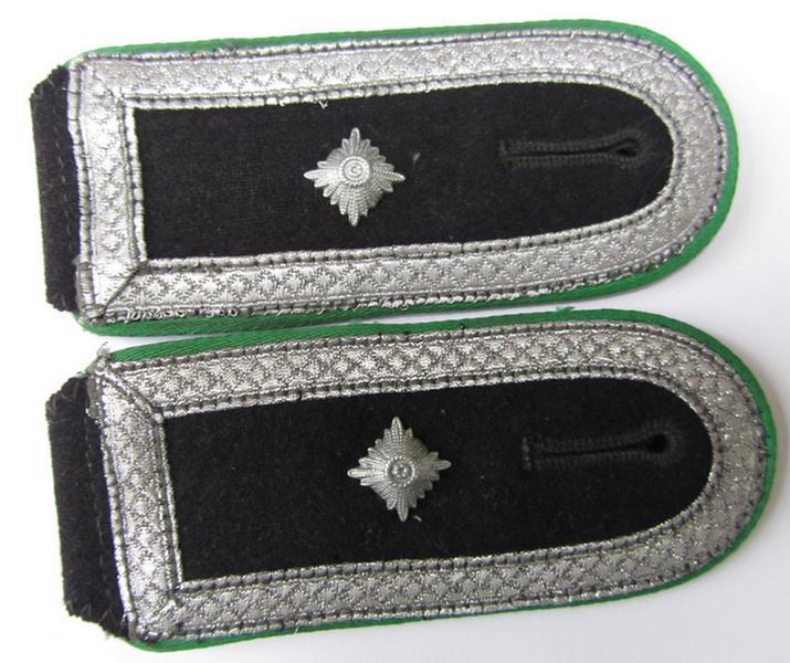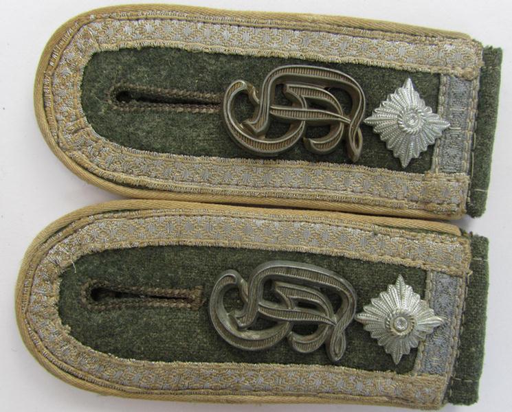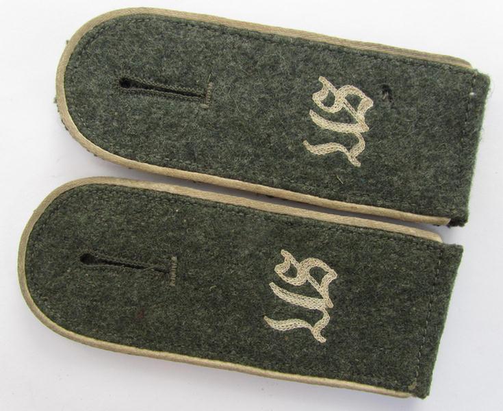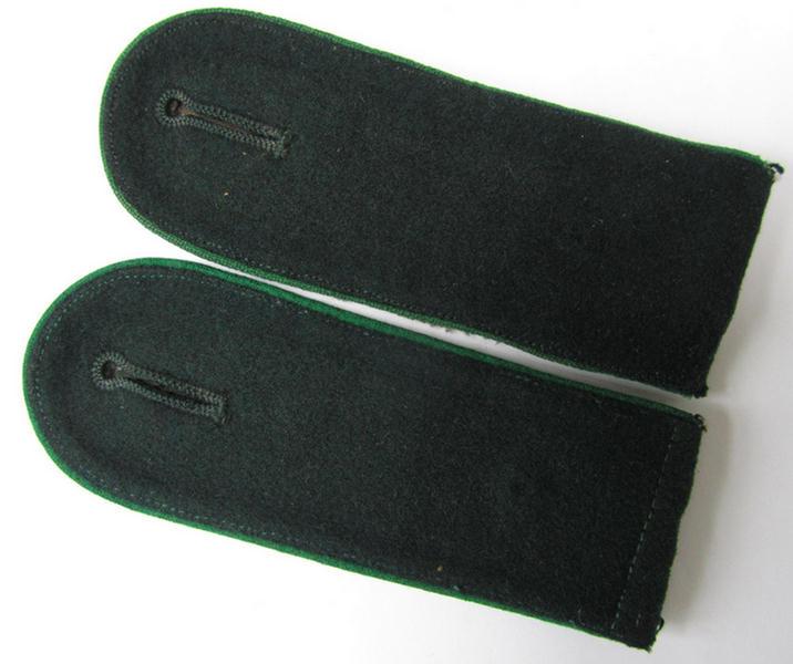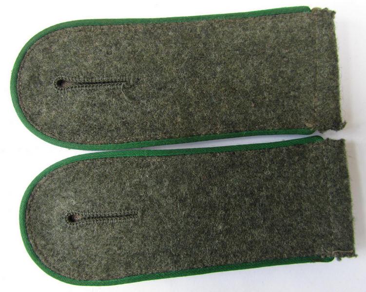 This is a truly very nice - and rarely encountered and fully matching! - pair of WH (Heer), IMO early-war period, soldiers-type shoulderboards, as intended for a: 'Soldat der Gebirgsjägertruppen' (mountain-troops soldiers), in overall very nice, albeit slightly used ie. clearly worn condition. The boards - which have the standard darker-green coloured, woolen upper-decks - have the neat darker-green aka Wiesengrün (and woolen-type) piping attached and measure both approximately 12,5 cms. in length. They come on their original tongues and are in a very nice, ie. fully text-book condition overall. The set shows as stated above moderate usage and/or wear (some age, dust and staining is visible). Simply a very nice and desirable Gebirgsjäger-soldiers-type pair that came directly from a German flea-market and that was never before in a collection: I do not exactly know for what reason but these simple 'Soldat der Gebirgsjägertruppen' shoulderboards can easily be considered rare: this is only the third such great set I ever had on offer!