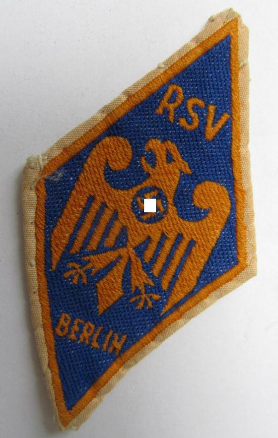 This is a truly very nice - and actually never before encountered! - IMO 'Reichsbahn' (ie. railway) related sportshirts' badge, which is executed in neat 'BeVo'-weave pattern, depicting a - left facing! - eagle, swastika and abbreviation: 'RSV - Berlin' (possibly meaning: 'Reichsbahn Sport Verein' based in Berlin), in overall very nice albeit clearly used ie. worn and shirt-removed condition. The patch - which is executed in a 'Raute'-format and measures approximately 9,5 x 5 cms. - is beautifully woven in golden-yellow coloured linnen on a bluish background (neatly executed in so-called 'BeVo'-weave pattern). This is simply one of those rare TR-period cloth insignia that IMO merits further investigation: I have never seen one nor could find any reference for such badge ie. association. In any case is it a very nice and truly unusual (sports-related ie. Reichsbahn related?) insignia: maybe the only such rare cloth item I can ever offer!
