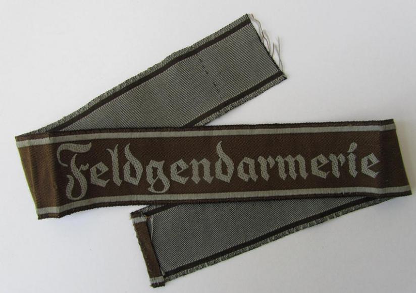 This is a truly very nice example of the - actually scarcely encountered! - BeVo-woven armband entitled: 'Feldgendarmerie', executed in bluish-grey coloured linnen, interwoven on a rust-brown coloured (equally linnen-based) background, in clearly used and IMO most certainly uniform-removed condition. The piece still shows its (original) stitching holes and was only minimally shortened for wear: it now measures in total 40 cms. in length (only one of the ends shows a folded end). Of additional interest is also the fact that it is clearly visible where both ends were stitched to the tunic. The piece was never cleaned and shows normal age and staining. A nice and truly not that often encountered cuff-title as used by the (notorious!) 'Feldgendarmerie' (field-police) staff-members: only the third such example I ever had on offer!