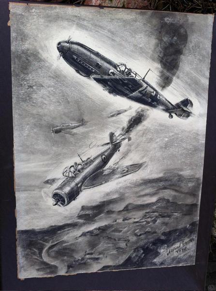 This is a very nice - and unique! - charcoal-drawn, large-sized PK (= 'Propaganda-Kompanie') drawing of a German WWII fighter-plane (ie. Messerschmitt ME109) conducting an air-battle with an allied figther-plane, neatly signed and/or dated by the artist being a painter named: Alfred Dudda - 1940, in very nice condition overall. The neat piece - which was period drawn on fairly thick paper and is sized: 61 x 44 cms. - is in very nice condition overall: it was most certainly formerly framed (signs still present and visible on the back). It is also neatly ink-stamped on the back with a square-based-stamp that reads: Freigegeben Bildpresse 15 Juli 1940). The - truly detailed and very artistic! - piece was IMO most certainly professionally drawn and was most likely intended for usage within a period publication or propaganda-magazine (such as for example: Der Adler and/or Signal). I could not find much reference about the - most certainly talented! - artist named: Alfred Dudda (9-1-1917 - 28-03-1983) and only found that he was a professional painter and illustrator of books and/or dust-covers for various books: he also served within WWII (more details unknown to date). This drawing was recently uncovered at a private house-hold and was found together with the other Dudda piece that I offer under number: 26078: both pieces are most certainly very interesting and IMO accordingly priced: something that can be underlined by the fact that a similar poster (which are often issued in numerous examples) often costs the same or even more! Simply a very nice WH Luftwaffe period-item that would look awesome if re-framed!