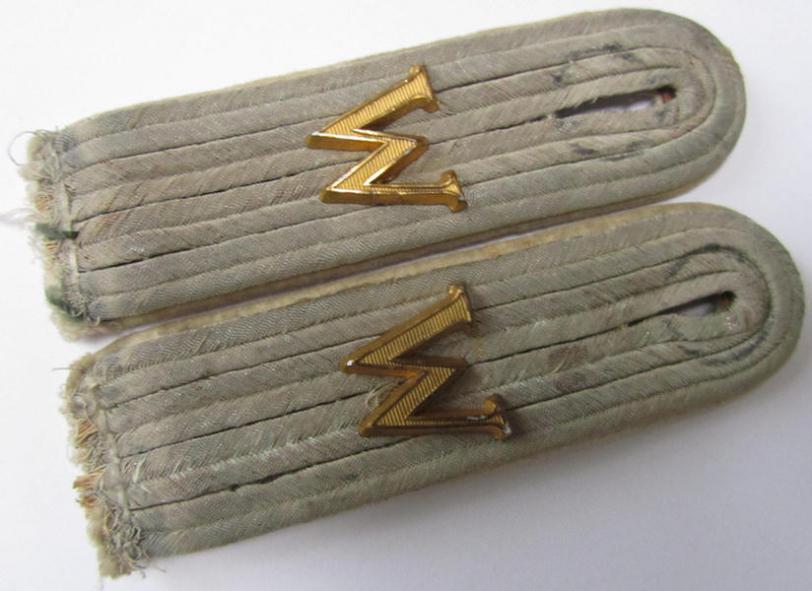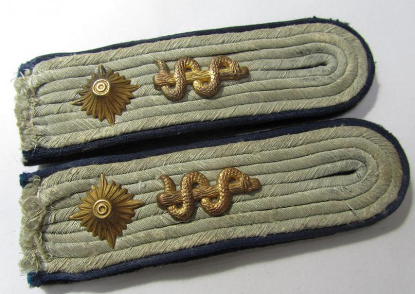 This is truly superb pair of Waffen-SS, darker-blue piped and neatly 'cyphered', officers-type shoulderboards, as intended for an: 'SS-Obersturmführer der Sanitätstruppen' (medical lieutnant first class ie 'Arzt'), in overall very nice, albeit clearly used ie. tunic-removed condition. Both straps are executed in the black (smooth type) black wool (having neat greyish-coloured ie. sub-dued silver-coloured upperdecks) and have the silk-like-type, darker-blue coloured, piping as to be expected. The boards come with their golden-toned 'Aeasculapus'-type cyphers attached and both show an (identical) golden-toned pip attached (dennoting the rank of 'SS-Obersturmführer der Sanitätstruppen'). The set is fully 'text-book' in all facets: they are of the 'sew-in type' and have carefully been tunic-removed. A truly attractive set of medical Waffen-SS officers' shoulderboards that is IMO accordingly priced!