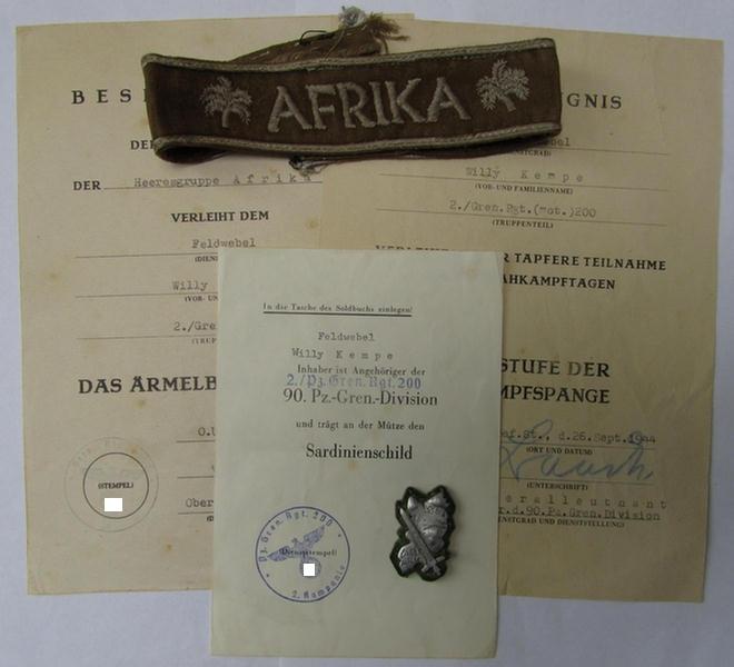 This is a truly awesome - and rarely encountered! - 5-piece WH (Heeres/Grenadiere ie. DAK or Deutches Afrikakorps) award(-document) grouping, respectively comprising of the documents for repectively the Nahkampfspange der II. Stufe in Silber (or silver close combat clasp / CCC), the Afrika cuff-title (plus armband!) and a decorative and rare document for the Traditions/Errinnerungsabzeichen des 90.Pz.-Gren.-Division (also known as: Sardinienschild (plus Abzeichen!), all as awarded to ie. worn by the (Ober-)Feldwebel Willi Kempe, who served with the: 2./Gren.Regt.(mot.) 200, all five pieces in nice albeit issued ie. worn albeit undamaged condition. The set comprises of a neat (A-5 sized) WH (Heer)- ie. 'DAK'- (or 'Deutsches Afrika Korps') related standard award-document (or Besitzzeugnis) as issued for the 'Afrika'-cuff-title ('Ärmelband Afrika') on 23 March 1944. The document was awarded to the (then) Feldwebel (sergeant) Willi Kempe, member within the: 2./Gren.Regt.200. This - fairly scarcely encountered - award-document is in a nice, albeit slightly used albeit non-folded condition. It was awarded on behalf of the: 'Oberbefehlshaber der Heeresgruppe Afrika' is neatly - and clearly! - signed by an unidentified 'Oberleutnant und Adjutant', being most certainly Kempes commanding officer. It is nicely and accordingly ink-stamped and is not denazified nor hole-punched. The document came with a neat example of a textbook albeit worn example of a 'Afrika' cuff-title, in nice, albeit clearly used and/or tunic-removed, condition. The armband is IMO somewhat shortened but is still in almost full-length condition (ie. it measures 34 cms.) Both ends show some normal fraying as is more often encountered. The band is clearly used and shows some normal wear and age: it is also a bit stained and dirty (caused by normal wear). The cuff-title is executed in the brownish, so-called: 'Kamelhaar' (camel hair) and still shows the clear signs of having been once tunic-attached. It should be stated that these 'Afrika' cuff-titles are not commemorative cuff-titles (such as the 'Afrikakorps' cuff-title) but were regarded as official awards that needed official recognition. The second document in the grouping concerns a rare award-document (or Besitzzeugnis), as issued for a: Nahkampfspange der II.Stufe in Silber (CCC in silver), as awarded on 26 September 1944 to the (then) Ober-Feldwebel (sergeant 1st class) Kempe, member within the: 2./Gren.Rgt.(mot.)200. The document is a neat (A-5 sized) standard - pre-printed (ie. Vordrück-type) - award-document, in overall nice, albeit clearly used condition. The document is not denazified nor hole-punched and is just somewhat yellowed by age as usual: it shows one (non-disturbing and neatly restored) tear in the upper right corner). The document is nicely - and clearly! - signed by the Generalleutnant u. Kommandeur des 90.Pz.-Grenadier-Division named: Ernst-Günther Baade (20-8-1897 - 8-5-1945). Baade was a famous career army-officer who won almost all grades of the Ritterkreuz des Eisernen Kreuzes (or Knight's Cross of the Iron Cross). He won his RK as early as on 27-6-1944, his EL on 22-2-1944 and was the 111th recipient of the SW des RK! Also this neat document is nice and clearly ink-stamped. Here it should be mentioned that these pre-printed ie. official CCC award-documents are much lesser encountered than their often machine-typed and/or provisional counterparts, especially when intended for the second class! The third and last award-document is a very rarely encountered, small-sized (ie. 15,5 x 10 cms. sized) pre-printed (ie. Vordrück-type) - award-document as intended for the Traditions/Errinnerungsabzeichen des 90.Pz.-Gren.-Division (also known as: Sardinienschild). Also this document is in wonderfull condition: it is clearly ink-stamped and not folded, hole-punched nor denazified. This document comes with a neat, alumnium-based (variant-type and possibly hand-fabricated-) version of the Sardinienschild as most certainly worn by Kempe. The neat shield is backed with thicker, green-coulored woolen cloth (enabling easy attachment on the cap). The grouping originates from a German flea-market and was never before in a collection: it was found as such and only misses the silver Nahkampfspange! At the time of the awards (ie. March/September 1944) Kempes unit, the: 2./Gren.Regt.(mot.)200 ie. the: 90.Pz.-Grenadier-Division saw as possibly known heavy action on the Italian war-front (amongst others in Monte Cassino). I am convinced that this neat grouping would merit further investigation. Simply a very nice and rarely encountered grouping that belonged to a Heeres NCO and veteran of the Afrika-campaign!
