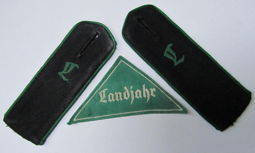 This is a nice and actually fairly rare item: a set, comprising of a matching pair of 'Hitlerjugend (HJ) 'Landjahr' shoulderboards (having chain-stitched: 'L'-cyphers!) and a green 'Landjahr' triangle, all in a clearly used and worn condition. The shoulderboard pair and triangle - which all three were once glued in an album and show some glue-remains on the backs - have clearly been used and do all show some normal wear and aging. The pair is of the sew-in type (without having tongues). The Gothic 'L' is beautifully chain-stitched in the typical light-green branch-colour (similar to the piping). All three items are void of their paper 'RzM' etikets: these were most certainly lost when worn. The purpose of the 'HJ-Landjahr', which was introduced in 1934, was to 'deepen the ties connecting the young people of urban areas with the land and peasentry'. The boards and triangle most certainly belonged to the the same bearer: all three items originate from a private household and were never before in a collection. A truly nice and failry rare set of youth items!