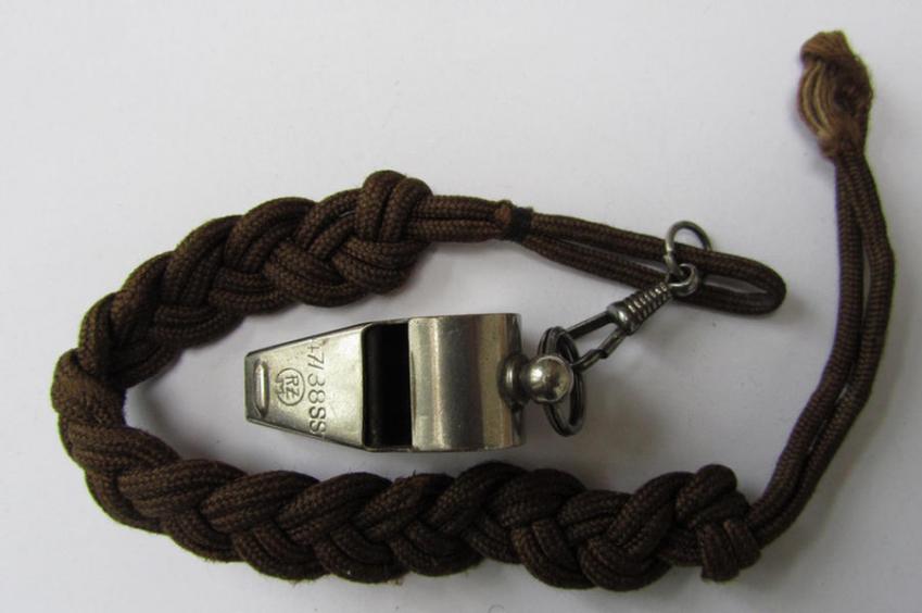 This is a very nice - and truly rarely encountered! - chrome-coloured, metal-based flute, that is neatly marked: RzM 47/38 SS and that comes on its original brownish-green coloured lanyard as issued and found, in overall nice and fully functional condition. These flutes were a 'standard' equipment item for all NCO's and were used during exercises, training as well as at the front. Taken into account the marking I deem this a pre-war and rare SS-Verfügungstruppen-related item. The linnen-based lanyard - which measures approximately 31 cms. - shows some wear and age but nothing too shocking: the neat chromed flute is of course still fully functional. A very nice 'equipment'-item that is not that often encountered. Just the first such nice and rare example I ever had on offer!
