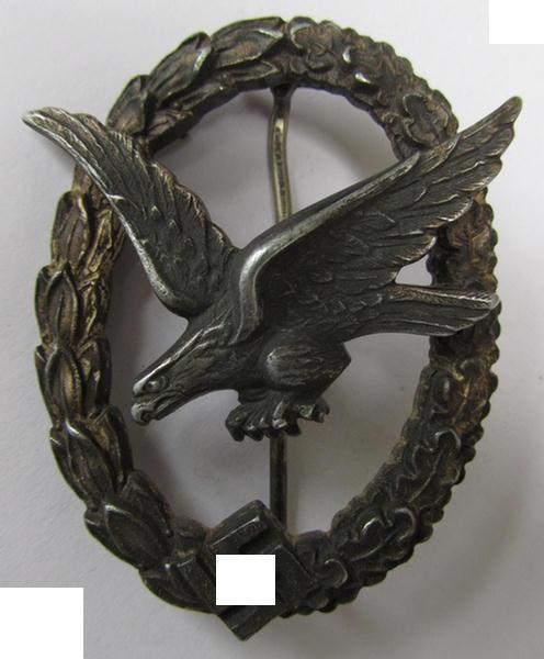 This is a very nice example of a neatly maker-marked WH (Luftwaffe) 'Fliegerschützenabzeichen ohne Blitzbündel' (or air-gunners-badge without lightning bolts), being a so-called, silvered zinc-based (ie. Tombak) model as produced by the 'Wilhelm Deumer' company based in Lüdenscheid, in nice, albeit clearly used ie. worn condition. The badge retains a fair bit of its silverish finish but is also dirty ie. tarnished: it was IMO however never cleaned nor polished and has a somewhat 'darkened' age-patina as more often observed with these pieces. The piece naturally shows all the details on catch and hinge (such as the large, rectangular base plate and typical catch- and pin-set-up) as to be expected for a by 'Wilhelm Deumer' produced badge. It is also a bit converse in shape and naturally bears the mentioned maker-mark on the back (that clearly reads: 'Wilhelm Deumer Lüdenscheid'). The piece was clearly used and/or worn: something that can be easily noticed by the somewhat curved ie. sligthly bent pin. Of interest is also the fact that this piece is a true air-gunners-badge WITHOUT having had the lightning bolts: sometimes a regular badge was used that simply had its bolts removed. The piece originates from a private German house-hold and was found together with the small Segelflieger-grouping which I offer under number: 26601. Simply a nice and honest 'Fliegerschützenabzeichen ohne Blitzbündel' that shows character!