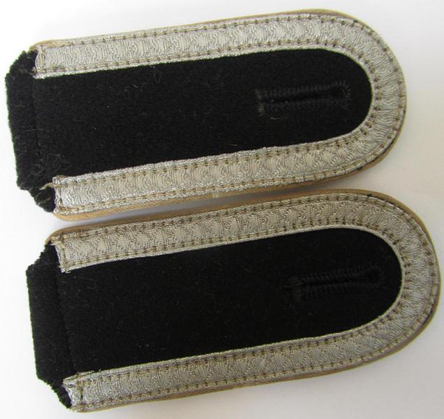 This is a truly very nice - and fully matching! - pair of (IMO mid-war period), white-piped Waffen-SS NCO-type shoulderboards, as intended for a: 'SS-Unterscharführer der Infanterie' (infantry junior sergeant), in very nice, albeit sligthly used and/or minimal worn condition. The boards have the neat and very desirable (white-coloured) 'silk-like'-type piping, show a black-coloured upperdeck and field-grey-woolen underlay and have the standard silverish-grey toned NCO-braid attached. The set comes on its functional - typical Waffen-SS shaped! - tongues and is approximately 11 cms. sized in length. The set - which originates from my own shoulderboard collection - was IMO only slightly used: it shows some truly minimal wear and age. The set - which I personally found at a private house-hold several years ago - is in truly wonderfull condition and simply cannot be upgraded. As most certainly known are all Waffen-SS NCO-type boards to be considered rare and very hard to encounter: those matching pairs, piped in white (Infanterie) having attachad tongues even more so! Simply a very nice and desirable pair of Waffen-SS infantry boards in a truly wonderfull condition: only the second such rare and desirable set I ever had on offer!