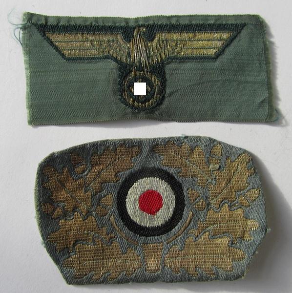 This is a very nice - and actually extremely rarely encountered! - set comprising of a WH (Heer) General officers overseas cap-eagle and matching cocarde, both of the so-called 'M36' model, both as intended for usage on the General officers-model so-called 'Knautschmützen' or 'Alter-art' visor caps, in overall partly used ie. pre-folded and/or cap-removed condition. Both rare insignia-pieces are executed in the neat so-called BeVo-weave 'flat-wire'-style and are in a wonderfull condition overall. These nice eagles were intended for usage on the 'Knautschmützen' ie. 'Alter-art' visor caps and were also seen worn on 'high-quality' officers' 'Schiffchen' (or side-caps): the cocarde was naturally only intended for usage on the visor-caps. Both eagle and cocarde are executed in golden-toned thread on a lighter-greenish-grey (linnen-based) background. The eagle is in mint-/unissued condition whereas the cocarde is in a clearly used and/or worn condition (stitching-holes are visible) and has been pre-cut ie. pre-folded (and is as such ready for easy re-attachment!). It should be noted that these complete general-officer-sets are almost never offered for sale. A very nice and desirable set!