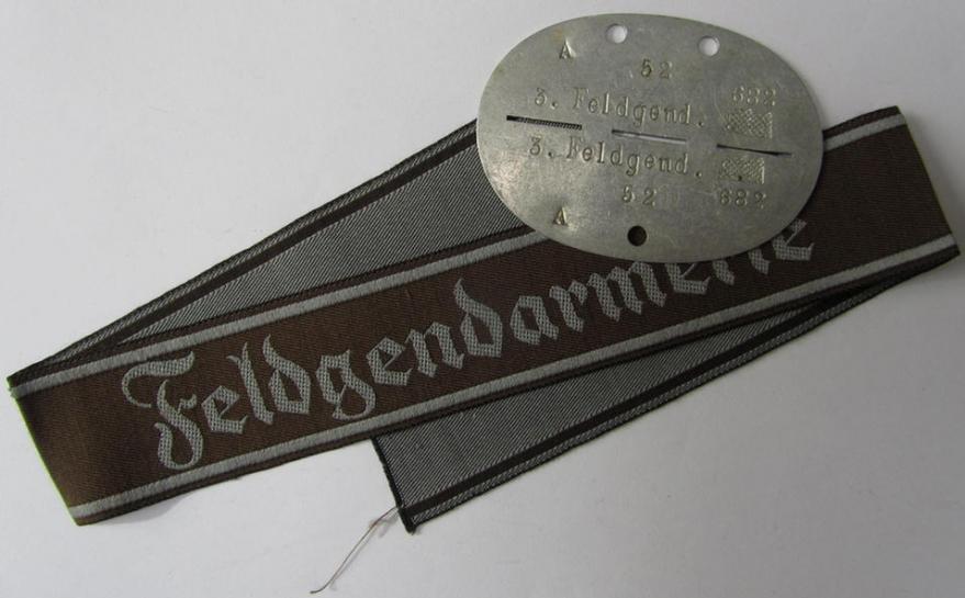 This is a truly awesome 2-piece WH (Heeres) 'Feldgendarmerie' (ie. field-police) grouping, comprising of very nice ie. stonemint example of a - scarcely encountered! - 'BeVo'-woven armband, entitled: 'Feldgendarmerie' and a neat (and equally rarely encountered!) aluminum-based ID-disc, stamped: '3.Feldgend.682', both items in overall very nice condition. The 'BeVo'-woven armband entitled: 'Feldgendarmerie' is executed in bluish-grey coloured linnen, interwoven on a rust-brown coloured (equally linnen-based) background. The piece is in full-length condition and measures in total 44 cms. in length. The piece - which has two unfinished ends as more often encountered - was IMO simply never worn: it simply shows no age nor staining and cannot be upgraded. The cuff-title came together with a neat ID-disc that originated from the same bearer. This disc - which is executed in neat aluminium - bears the stamped unit-signification: '3. Feldgend. 682', signifying that the soldier who wore it served within the 3rd company of the 'Feld- gendarmerie-Abteilung' numbered: '682'. Of additional interest is the fact that the soldier was once transferred: the previous 'Feldgendarmerie-Abteilung' in which he served was (IMO) numbered: '524' (this is period 'deleted'). The soldiers' blood-group type can also be noticed: type 'A'. The fact that this unit was comparetively small can be elborated by the fairly low number: '52'. The disc was clearly worn and shows fairly 'torn-out'-holes. The 'Feldgendarmerie-Abteilung 682' saw action in Poland, France and Southern Russia and was part of the: '1.Panzer-Armee' ('Heeres-Gruppe Mitte'). This group originates from a private house-hold in Germany and was found together: I naturally decided to also sell both items as a set and will not separate them. Simply a very nice and truly not that often encountered small grouping as used by a (notorious!) 'Feldgendarmerie' (field-police) staff-member: simply the best such set I ever had on offer!