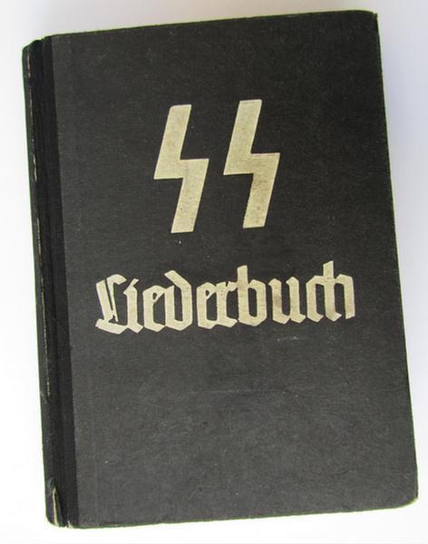 This is a truly great example of the fairly rarely encountered SS- ie. Waffen-SS-related so-called: 'SS-Liederbuch (songbook), being a (semi-hard-cover) ninth edition, as issued by the 'Rasse-und Siedlungshauptamt SS', in overall very nice, albeit clearly used ie. issued condition. The black-coloured (and partly linnen-covered) booklet - which is sized: 16 x 10 cms. and retains all its 264 (!) pages - is as stated in a wonderfull condition overall: it was just fairly used. Of additional interest is the fact that the first page bears a clearly readable (blue-coloured) ink-stamp that reads: 'Fürsorge-Referent - SS-Oberabschnitt Main - Nürnberg - Ernst von Rath-Allee 20'. These small-sized SS song-booklets were much welcomed and loved by the SS-soldiers. The (semi-hard bound) booklet just shows minmal age and wear (something that is remarkable due to the bad quality paper used and its comparative fragility). It just shows some minimal yellowing caused by storage and/or age. The cover shows (fully present!) white-coloured Rune-signs and Liederbuch-text, something that is also not that often encountered. I simply had to acquire this item (although its high asking price!) for the web-site. Simply a very nice and desirable SS item: without doubt a very nice and fairly rarely encountered item!