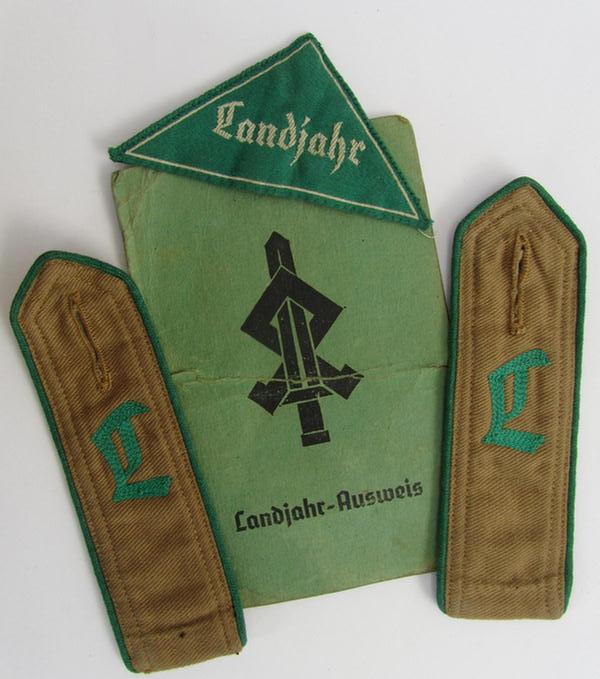 This is a truly very rarely encountered and fully matching! - 4 piece set, comprising of an awesome pair of early-type and light-brown coloured 'Hitlerjugend (HJ) 'Landjahr' shoulderboards (having the neat chain-stitched: 'L'-cyphers), a neat HJ-'Landjahr' district-triangle and a never before encountered Landhahr-Ausweis (or ID document) as issued in 1939 to the HJ-member (or Hitlerjunge) Albert Fuhlmann born in 1925, all items in a very nice albeit used ie. worn condition. The set was recently found at a German private house-hold and was never before in a collection. The purpose of the 'HJ-Landjahr', which was introduced in 1934, was to 'deepen the ties connecting the young people of urban areas with the land and peasentry'. As stated above have all items clearly been used and all do show some normal wear and/or aging. The neat (and early-type!) shoulderboard-pair is of the sew-in type (without having tongues). The Gothic 'L' is beautifully chain-stitched (Kurbelstickerei) in the typical light-green branch-colour signifying Landjahr usage (similar to the rayon-based piping). The district-triangle is in equally used ie. worn condition and simply cannot be upgraded. Both epaulettes and triangle are void of their paper 'RzM' etikets: these were most certainly lost during wear or usage. The set also holds a neat (and never before encountered!) Landhahr-Ausweis (or ID document) as issued in 1939 to the HJ-member (Hitlerjunge) Albert Fuhlmann (or alike) born in 1925. The neat document - folded sized: 13 x 8,5 cms. - bears a neat uniform-photo and is nicely ink-stamped and/or filled-in. The shoulderboards, triangle and Ausweis most certainly belonged to the the same bearer who kept these items for decades: all four items originate from a private household and were never before in a collection. A truly nice and rare set of rare youth items: only the first such set I ever had on offer!